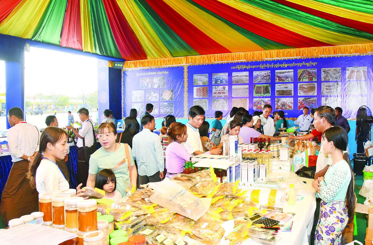 အလားတူ နေပြည်တော်ကောင်စီ အပါအဝင်တိုင်းဒေသကြီးနှင့် ပြည်နယ်များမှထွက်ရှိသည့် MSME ထုတ်ကုန်များနှင့် ရိုးရာအစားအစာများ၊ တိုင်းရင်းသား ရိုးရာအမှတ်တရပစ္စည်းများ၊ ရိုးရာဝတ်စုံများကို ပြည်သူများ စိတ်ကြိုက်ဝယ်ယူနိုင် ရန်အတွက် ဈေးနှုန်းချိုသာစွာ ရောင်းချပေးလျက်ရှိပြီး ချစ်ခင်နှစ်သက်မြတ်နိုးစွာဖြင့် ဝယ်ယူကြသူများဖြင့်လည်း စည်ကားလျက်ရှိရာ ဒေသအလိုက်ဆောင်ရွက်နေသည့် MSME လုပ်ငန်းများ ဖွံ့ဖြိုးတိုးတက်စေရန် အားပေးမြှင့်တင်ပေးရာရောက်သည့် မြင်ကွင်းတစ်ခုလည်းဖြစ်သည်။