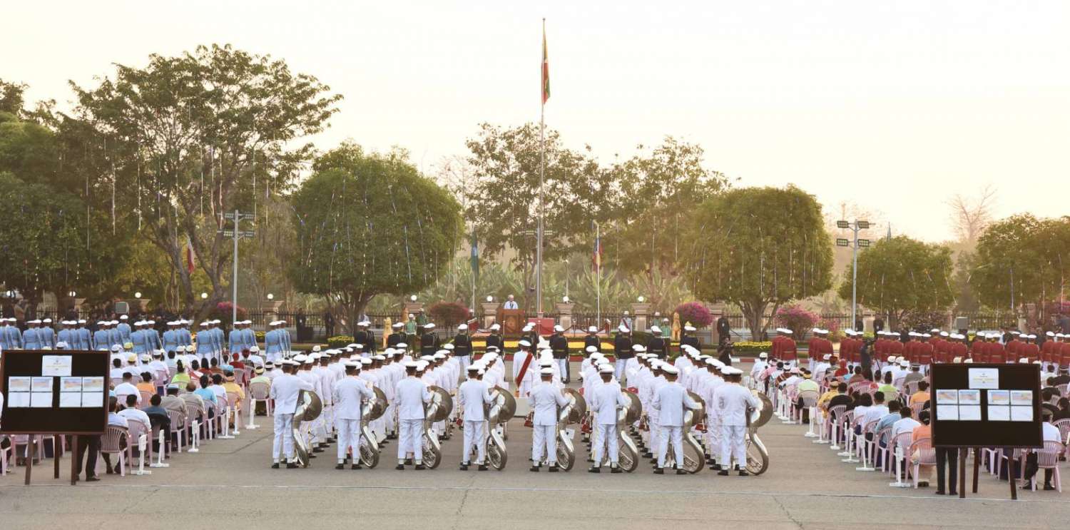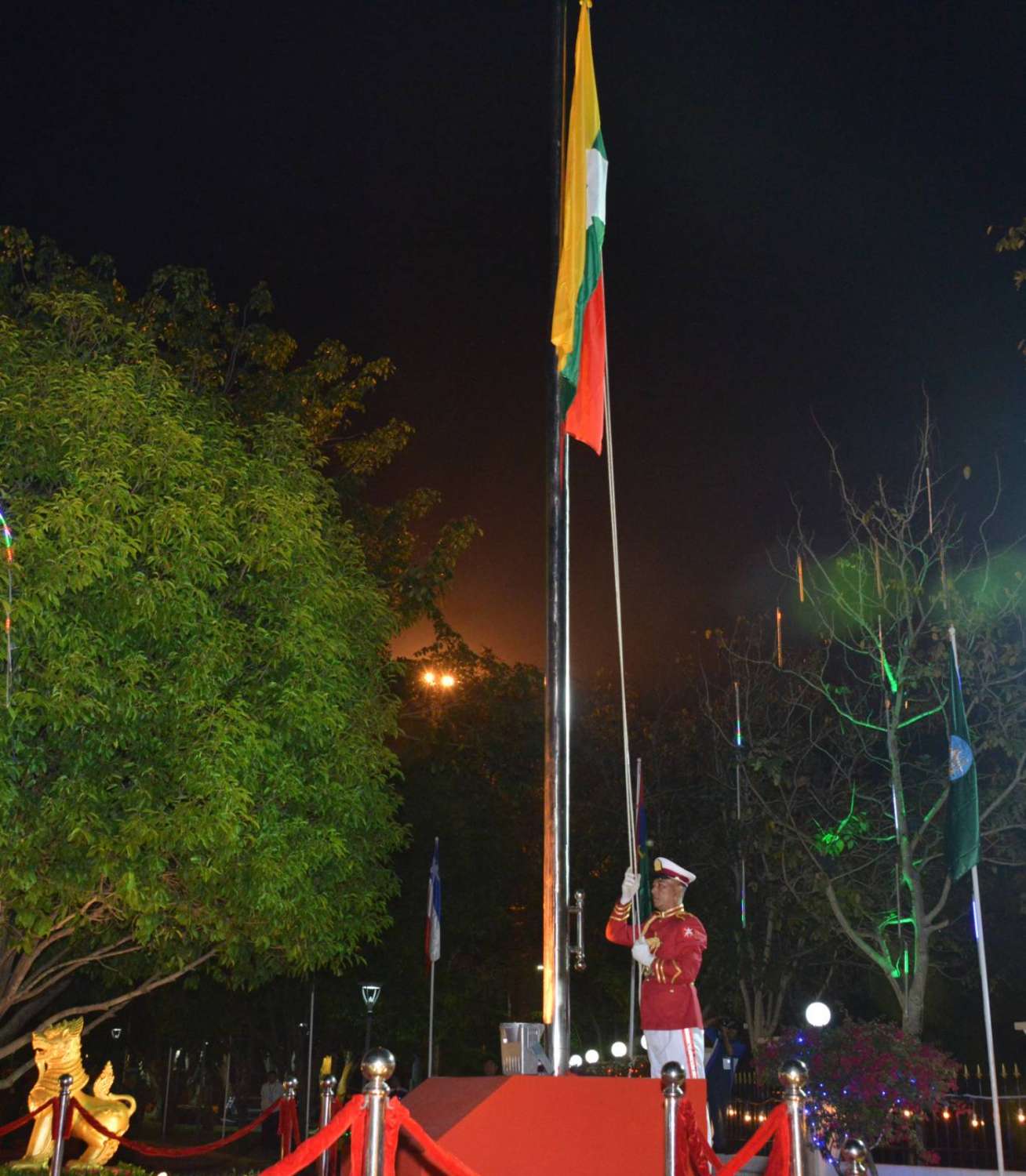 ထို့နောက် နိုင်ငံတော်စီမံအုပ်ချုပ်ရေးကောင်စီဒုတိယဥက္ကဋ္ဌသည် တက်ရောက်လာကြသူများနှင့်အတူ ပြည်ထောင်စုသမ္မတမြန်မာနိုင်ငံတော်အလံကို အလေးပြုရာ ဂုဏ်ပြုတပ်ဖွဲ့က နိုင်ငံတော်သီချင်းကို တီးမှုတ်သည်။