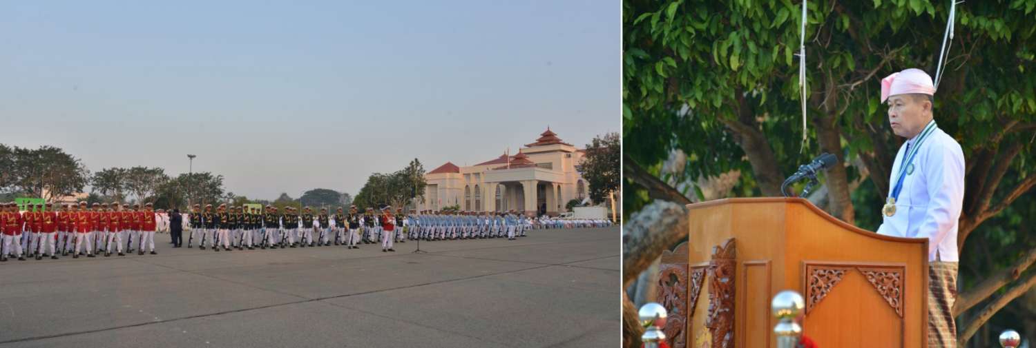 ဦးစွာ (၇၇) နှစ်မြောက် ပြည်ထောင်စုနေ့ နိုင်ငံတော်အလံတင် အခမ်းအနားကို နံနက် ၅ နာရီခွဲတွင်ကျင်းပရာ တိုင်းရင်းသားတိုင်းရင်းသူများနှင့်အတူ အလံတင်တပ်ဖွဲ့က ပြည်ထောင်စုသမ္မတမြန်မာနိုင်ငံတော်အလံကို လွှင့်တင်သည်။
