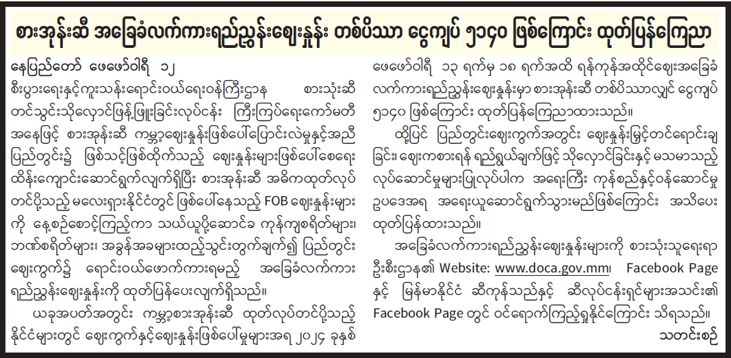 ရန်ကုန်မြို့နှင့် မန္တလေးမြို့အတွက် ရည်ညွှန်းလက်ကားဈေးနှုန်းများနှင့် ပြည်ထောင်စုနယ်မြေ နေပြည်တော်၊ တိုင်းဒေသကြီး/ ပြည်နယ် မြို့တော်များအတွက် ရည်ညွှန်းလက်လီဈေးနှုန်းများ