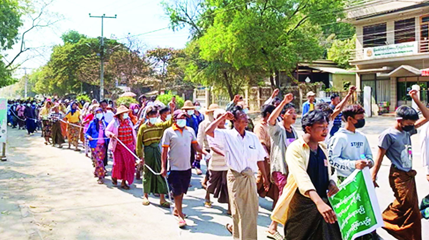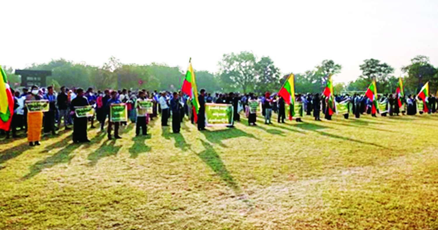 ဦးစွာ သက်ဆိုင်ရာမြို့နယ်များမှ ဒေသခံတိုင်းရင်း သားမျိုးချစ်ပြည်သူများက သတ်မှတ်နေရာအသီးသီး၌ စုဝေးကြပြီး ကျင်းပမည့်နေရာအသီးသီးသို့ ချီတက်ထောက်ခံကြသည်။ ချီတက်ရာလမ်းတစ်လျှောက်တွင် ဒေသခံမျိုးချစ်ပြည်သူများက “ဒို့တာဝန်အရေးသုံးပါးကို ထိန်းသိမ်းစောင့်ရှောက်ရန်အတွက် စစ်ပညာသင်ကြားရန်နှင့် နိုင်ငံတော်ကာကွယ်ရေးအတွက် စစ်မှုထမ်းဆောင်ရန် နိုင်ငံသားတိုင်းတွင် တာဝန်ရှိသည်၊ ပြည်သူ့စစ်မှုထမ်းဥပဒေကို အပြည့်အဝထောက်ခံကြိုဆိုပါသည်၊ နိုင်ငံတော်ကို ကာကွယ်ဖို့ တစ်မျိုးသားလုံးစစ်မှုထမ်းဆောင်ကြပါစို့၊ နိုင်ငံတော်ကို ပြည်တွင်း/ ပြည်ပ အန္တရာယ်များက ကာကွယ်ဖို့ စစ်မှုထမ်းဆောင်ကြပါစို့၊ နိုင်ငံတော်၏ လွတ်လပ်ရေး၊ အချုပ်အခြာအာဏာနှင့် နယ်မြေတည်တံ့ခိုင်မြဲရေးတို့ကို ကာကွယ်စောင့်ရှောက်ရေးသည် နိုင်ငံသားတိုင်း၏ တာဝန်ဖြစ်သည်” စသည့်ကြွေးကြော်သံများကို သံပြိုင်ကြွေးကြော်ခဲ့ကြပြီး သတ်မှတ်နေရာ အသီးသီးတွင် ပြည်သူ့စစ်မှုထမ်းဥပဒေအား ကြိုဆိုထောက်ခံပါသည်ဟု တစ်ခဲနက်ဆန္ဒထုတ်ဖော်ဟောပြောကာ ငြိမ်းချမ်းစွာလူစုခွဲခဲ့ကြကြောင်း သတင်းရရှိသည်။