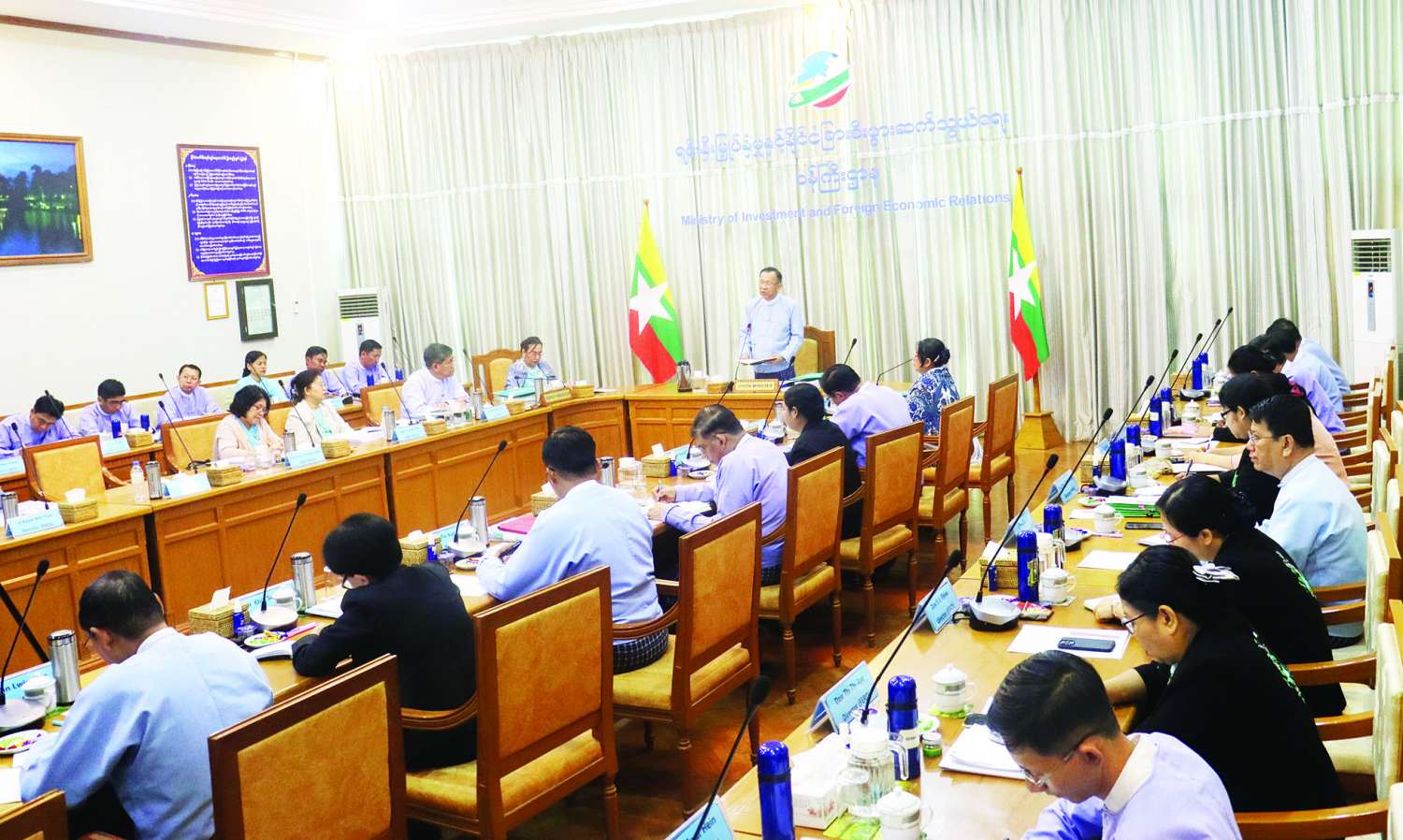 ယင်းနောက် နိုင်ငံခြားစီးပွားဆက်သွယ်ရေးဦးစီးဌာန ညွှန်ကြားရေးမှူးချုပ်က နှစ်နိုင်ငံ ပူးပေါင်းဆောင်ရွက်မှုများ၊ အာဆီယံအပါအဝင် ဒေသတွင်းပူးပေါင်းဆောင်ရွက်မှုများ၊ ကုလသမဂ္ဂနှင့် နိုင်ငံတကာအဖွဲ့အစည်းများအကြား ညှိနှိုင်းပေါင်းစပ် ဆောင်ရွက်ပေးလျက်ရှိသည့်အခြေအနေများ၊ ဖွံ့ဖြိုးမှုစီမံခန့်ခွဲရေးနှင့် ပူးပေါင်းဆောင်ရွက်ရေး၊ နိုင်ငံခြားပညာသင်ကိစ္စရပ်များ ဆောင်ရွက်ပေးလျက်ရှိသည့်အခြေအနေများကို တင်ပြဆွေးနွေးသည်။ ဆက်လက်၍ ရင်းနှီးမြှုပ်နှံမှုနှင့် ကုမ္ပဏီများညွှန်ကြားမှုဦးစီးဌာနမှ ညွှန်ကြားရေးမှူးချုပ်က ပြည်တွင်း/ ပြည်ပ ရင်းနှီးမြှုပ်နှံမှုလုပ်ငန်းများမြှင့်တင်ရေး ဆောင်ရွက်မှုအခြေအနေများ၊ ပြည်တွင်းစီးပွားရေးလုပ်ငန်းရှင်များ အရည်အသွေးပြည့်ဝစွာ ဖွံ့ဖြိုးတိုးတက်ရေးအတွက် အားပေးကူညီဆောင်ရွက်မှုအခြေအနေများ၊ ဒေသတွင်းနှင့် နိုင်ငံတကာစီးပွားရေးလုပ်ငန်းများ ပူးပေါင်းဆောင်ရွက်မှု အခြေအနေများ၊ အလားအလာရှိသည့် နိုင်ငံခြားရင်းနှီးမြှုပ်နှံမှုကဏ္ဍများနှင့် နိုင်ငံသားရင်းနှီးမြှုပ်နှံမှုကဏ္ဍများ၊ ရင်းနှီးမြှုပ်နှံမှုတိုးမြှင့်ရေးအတွက် ဆက်လက်ဆောင်ရွက်မည့် အစီအစဉ်များနှင့် ရင်းနှီးမြှုပ်နှံမှုလုပ်ငန်းများတွင် ကြုံတွေ့နေရသည့်အခက်အခဲများနှင့်စပ်လျဉ်း၍ တင်ပြဆွေးနွေးသည်။