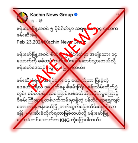 ကချင်ပြည်နယ်၊ ဗန်းမော်မြို့အဝင် ၅ မိုင်ဂိတ်မှာ အရပ်သား ၁၄ ယောက်ကို လုံခြုံရေးတပ်ဖွဲ့ဝင်များက ဖမ်းဆီးထားကြောင်း အဆိုပါဖမ်းဆီးခံရသူများသည် ဖေဖော်ဝါရီ ၁၈ ရက်နေ့က မံစီမြို့နယ်အတွင်း လုံခြုံရေးတပ်ဖွဲ့ဝင်များနှင့် KIA ၊ PDF အမည်ခံအကြမ်းဖက်သမားများ နှစ်ဖက်တိုက်ပွဲများ ဖြစ်ပွားခဲ့ခြင်းကြောင့် ဗန်းမော်မြို့သို့ ခေတ္တတိမ်းရှောင်လာသူများဖြစ်ကြောင်းနှင့် ပြည်သူ့စစ်မှုထမ်းဥပဒေပြဋ္ဌာန်းပြီးနောက် ဖေဖော်ဝါရီ ၁၇ ရက်နေ့ကလည်း ၎င်းဂိတ်တွင် ဖမ်းဆီးမှုများရှိကြောင်း ဒေသခံပြည်သူများ စိုးရိမ်ထိတ်လန့်စေရန်နှင့် အထင်အမြင်လွဲမှားဖွယ် သတင်းတု၊ သတင်းအမှားများကို တရားမဝင်ပြည်ဖျက်မီဒီယာအချို့က မဟုတ်မမှန် ရေးသားဖြန့်ဝေနေသည်ကို တွေ့ရှိရသည်။