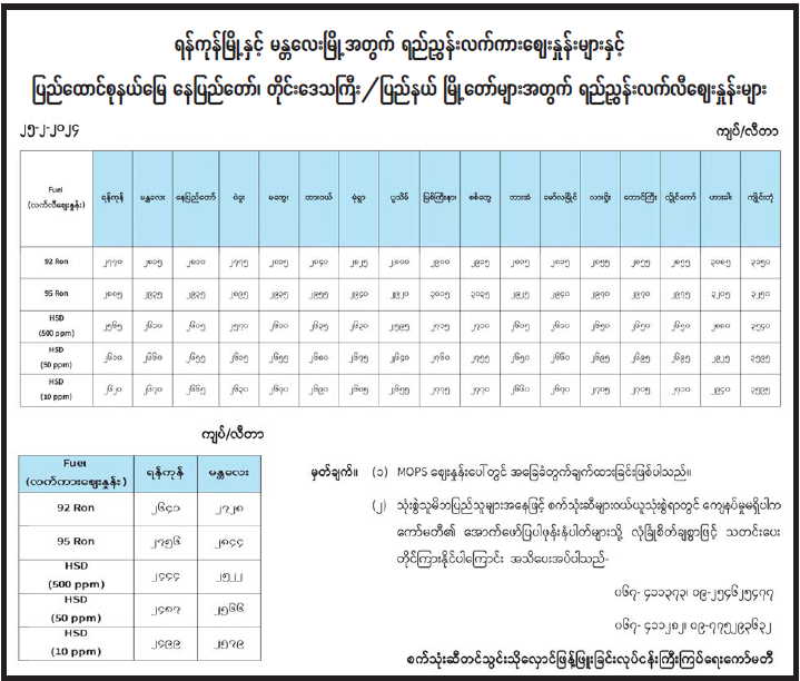 ရန်ကုန်မြို့နှင့် မန္တလေးမြို့အတွက် ရည်ညွှန်းလက်ကားဈေးနှုန်းများနှင့် ပြည်ထောင်စုနယ်မြေ နေပြည်တော်၊ တိုင်းဒေသကြီး/ပြည်နယ် မြို့တော်များအတွက် ရည်ညွှန်းလက်လီဈေးနှုန်းများ 02/25/2024