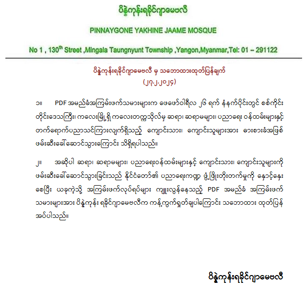 ပိန္နဲကုန်းရခိုင်ဂျာမေဗလီမှ သဘောထားထုတ်ပြန်ချက်