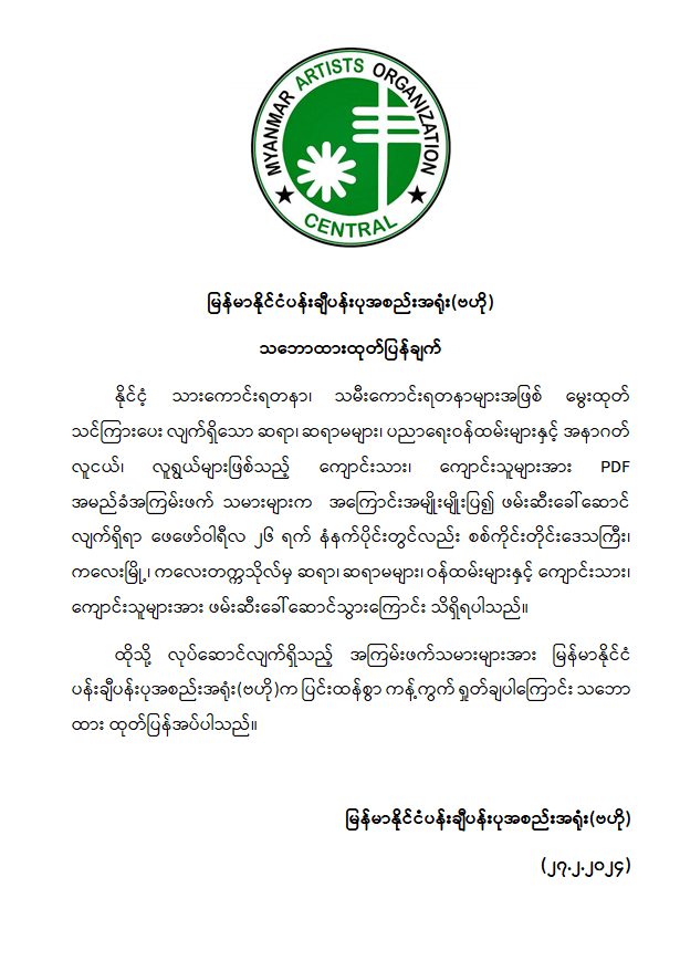 မြန်မာနိုင်ငံပန်းချီပန်းပုအစည်းအရုံး (ဗဟို) သဘောထားထုတ်ပြန်ချက်