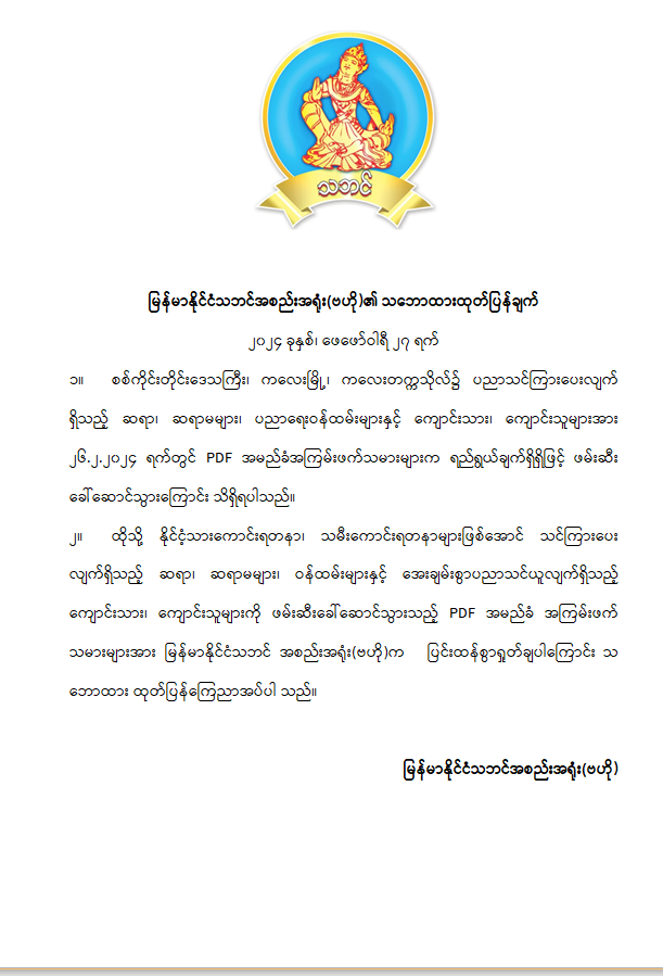 မြန်မာနိုင်ငံသဘင်အစည်းအရုံး (ဗဟို) ၏ သဘောထားထုတ်ပြန်ချက်