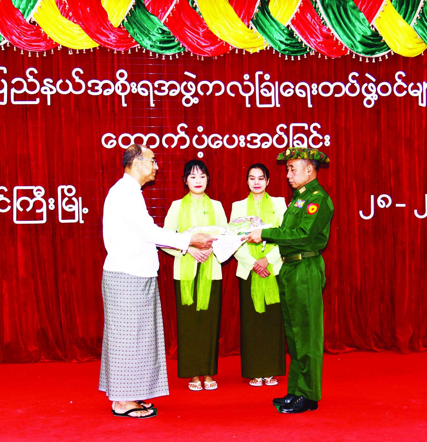 ဆက်လက်၍ စားသောက်ဖွယ်ရာများနှင့် ထောက်ပံ့ငွေများပေးအပ်ရာ နိုင်ငံတော်ကာကွယ်ရေးနှင့် လုံခြုံရေးတာဝန်များကို စွမ်းစွမ်းတမံထမ်းဆောင်လျက်ရှိသည့် လုံခြုံရေးတပ်ဖွဲ့ဝင်များနှင့် အသက်စွန့်လွှတ်ခဲ့ရသည့် လုံခြုံရေးတပ်ဖွဲ့ဝင်များအား စားသောက်ဖွယ်ရာ ပစ္စည်းနှင့်ငွေကျပ် ၁၅၆ သိန်းကို ရှမ်းပြည်နယ်ဝန်ကြီးချုပ် ဦးအောင်အောင်က ပေးအပ်ရာ အရှေ့ပိုင်းတိုင်းစစ်ဌာနချုပ် ဒုတိယတိုင်းမှူး ဗိုလ်မှူးချုပ် ဝင်းဇော်မိုးနှင့် ဦးစီးအရာရှိ ပထမတန်းပြည်သူ့စစ် ဒုတိယဗိုလ်မှူးကြီး သက်ဦးတို့ကလည်းကောင်း၊ နိုင်ငံတော်ကာကွယ်ရေးနှင့် လုံခြုံရေးတာဝန်များ စွမ်းစွမ်းတမံထမ်းဆောင်လျက်ရှိသည့် ပြည်နယ်ရဲတပ်ဖွဲ့ဝင်များအား အရှေ့ပိုင်းတိုင်းစစ်ဌာနချုပ် ဒုတိယတိုင်းမှူး ဗိုလ်မှူးချုပ် ဝင်းဇော်မိုးက ထောက်ပံ့ပစ္စည်းများ ပေးအပ်ရာ ပြည်နယ်ရဲတပ်ဖွဲ့ ဒုတိယ ရဲမှူးကြီး ကျော်ဝင်းလှိုင်ကလည်းကောင်း လက်ခံရယူကြ သည်။