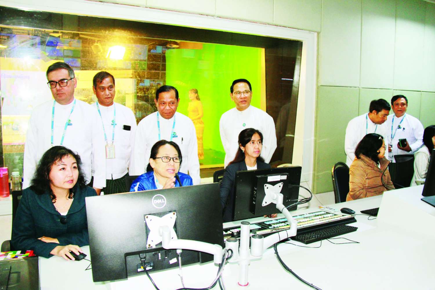 ယင်းနောက် News Studio(1)တွင် SD စနစ်မှ HD စနစ်သို့ အဆင့်မြှင့်တင်ခြင်းလုပ်ငန်းအား ငွေကျပ်သန်း ၁၅၇၀ ဖြင့် တင်ဒါအောင်မြင်ပြီး လုပ်ငန်းဆောင်ရွက်နေသော TMW Enterprise ကုမ္ပဏီ၏ ရိုက်ကူးရေးစနစ်၊ မီးနှင့်အသံစနစ်၊ ထုတ်လုပ်ပေးပို့မှုစနစ်များ ဆောင်ရွက်ပြီးစီးမှုနှင့် လက်တွေ့ရိုက်ကူးရေးဆောင်ရွက်နေမှုကို ကြည့်ရှုစစ်ဆေးသည်။
