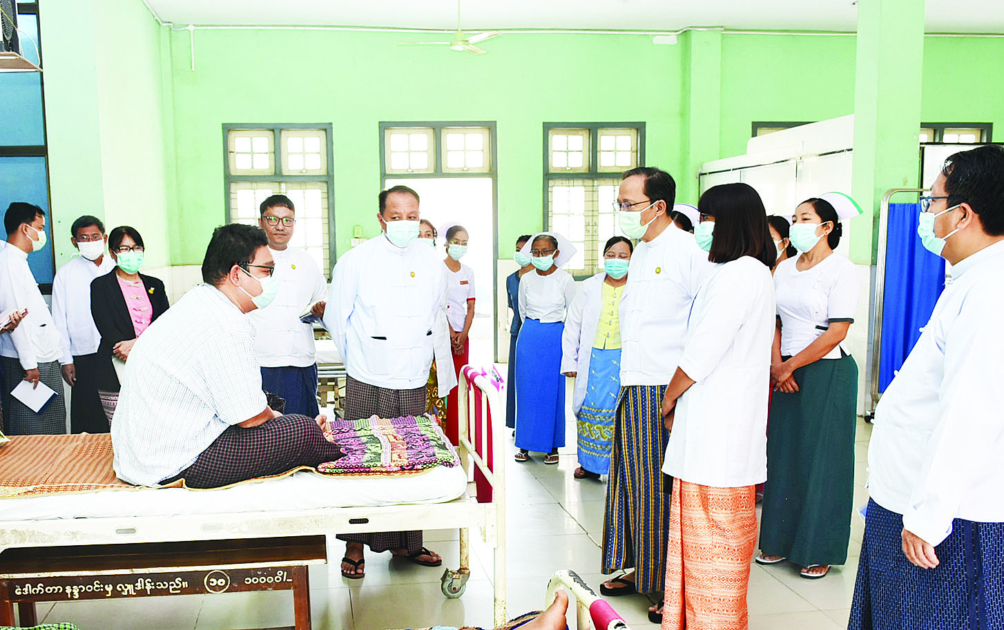 ထို့နောက် ပြည်ထောင်စုဝန်ကြီးသည် ပြည်သူ့ကျန်းမာရေး ဦးစီးဌာနနှင့်ကုသရေးဦးစီးဌာန ညွှန်ကြားရေးမှူးချုပ်များ၊ တာဝန်ရှိသူများနှင့်အတူ ပျဉ်းမနားမြို့ ပြည်သူ့ဆေးရုံကြီး သို့ရောက်ရှိပြီး အရေးပေါ်နှင့်ပြင်ပလူနာဌာန၊ ဓာတ်မှန်ဌာန၊ ခွဲစိတ်ကုသဆောင်၊ အရိုးကုသဆောင်၊ ဓာတ်ခွဲဌာန၊ ဆေးသိုလှောင်ခန်း၊ သားဖွားမီးယပ်ကုသဆောင်၊ ကလေးကုသဆောင်၊ မွေးကင်းစကလေးအထူးကြပ်မတ်ကုသဌာန၊ အထွေထွေဆေးကုသဆောင်တို့သို့ လှည့်လည်ကြည့်ရှု၍ လူနာနှင့်လူနာစောင့်များကို တွေ့ဆုံအားပေးစကားပြောကြားပြီး အာဟာရစားသောက်ဖွယ်ရာများ ထောက်ပံ့ကာ ဆေးကုသဆောင်အလိုက် လိုအပ်သည်များမှာကြားသည်။