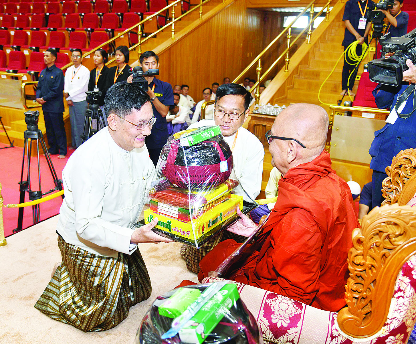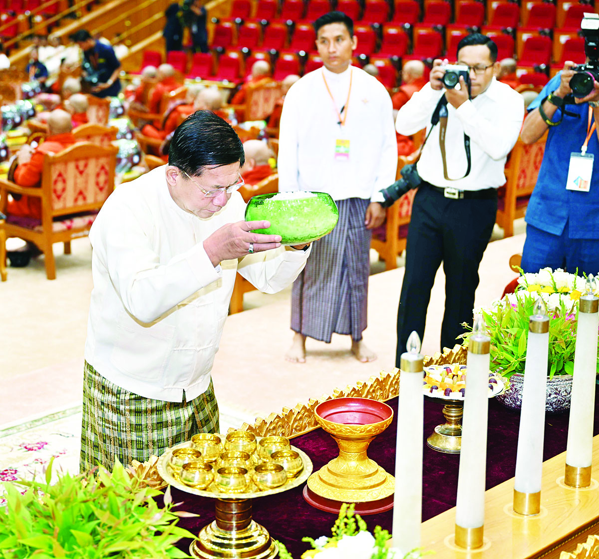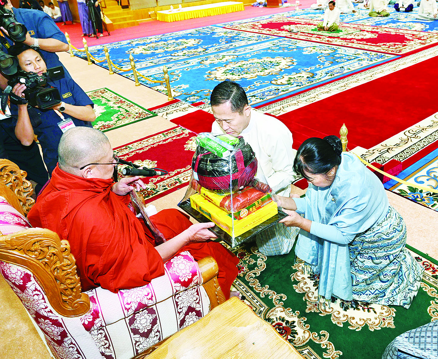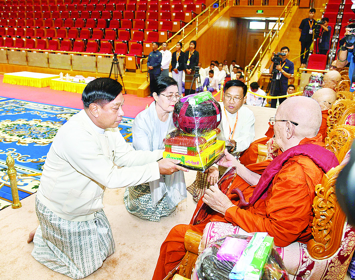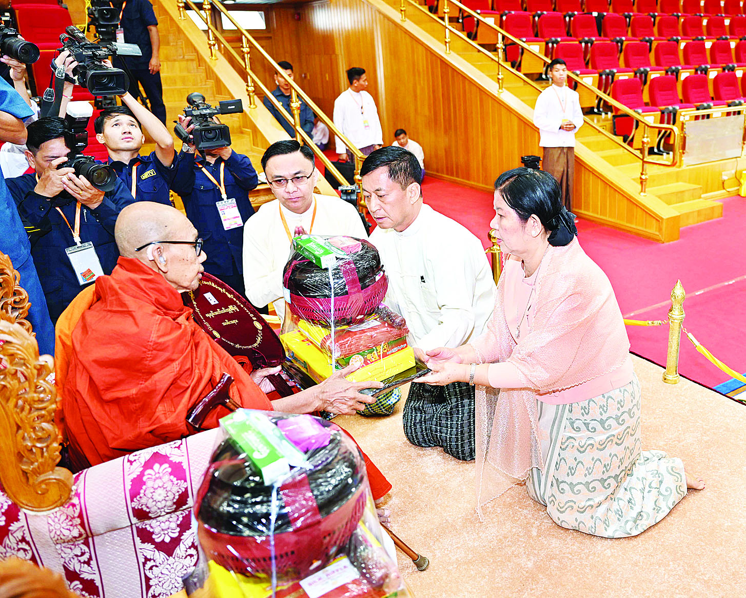၂၀၂၄ ခုနှစ်၊ သာသနာတော်ဆိုင်ရာ ဘွဲ့တံဆိပ်တော် ဆက်ကပ်ခံယူတော်မူမည့် ဆရာတော်ကြီးများအား နိုင်ငံတော်စီမံအုပ်ချုပ်ရေးကောင်စီဥက္ကဋ္ဌ နိုင်ငံတော်ဝန်ကြီးချုပ် ဗိုလ်ချုပ်မှူးကြီး မင်းအောင်လှိုင်နှင့် ဇနီး ဒေါ်ကြူကြူလှတို့က ယနေ့နံနက်ပိုင်းတွင် နေပြည်တော် မာရဝိဇယဗုဒ္ဓဥယျာဉ်တော် ပရိဝုဏ်အတွင်းရှိ အဂ္ဂါဓိပတိသာသနာ့ ဗိမာန်တော်ကြီး၌ နေ့ဆွမ်းဆက်ကပ်လှူဒါန်းသည်။