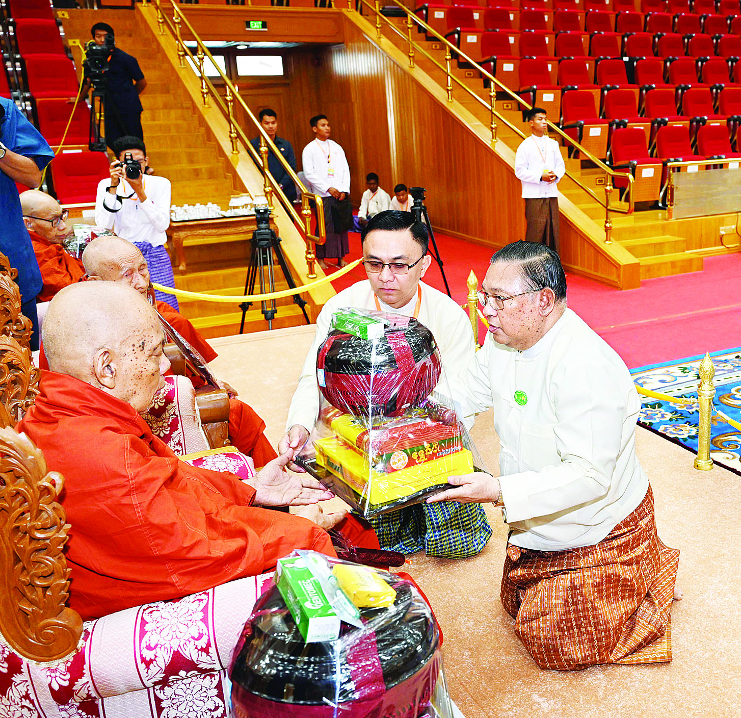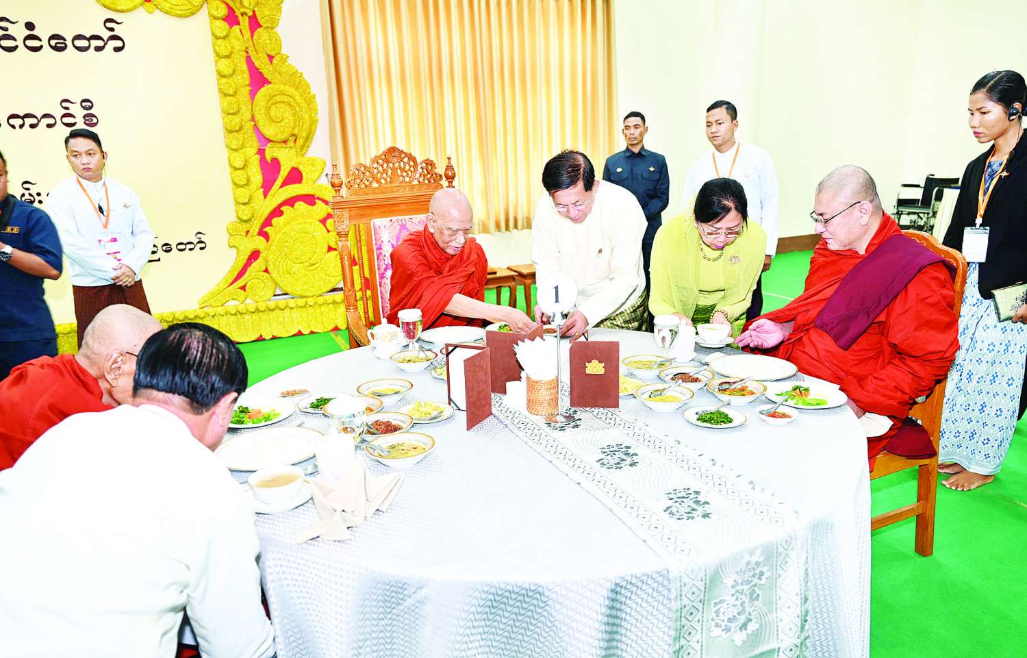 အခမ်းအနားအပြီးတွင် နိုင်ငံတော်စီမံအုပ်ချုပ်ရေးကောင်စီဥက္ကဋ္ဌ နိုင်ငံတော်ဝန်ကြီးချုပ် ဗိုလ်ချုပ်မှူးကြီး မင်းအောင်လှိုင်နှင့် ဇနီး၊ အခမ်းအနားတက်ရောက်လာကြသူများသည် နိုင်ငံတော်သံဃမဟာနာယကအဖွဲ့ဥက္ကဋ္ဌ အဂ္ဂမဟာပဏ္ဍိတ အဂ္ဂမဟာ သဒ္ဒမ္မဇောတိကဓဇ သန်လျင်မင်းကျောင်း ဆရာတော် ဒေါက်တာ ဘဒ္ဒန္တစန္ဒိမာဘိဝံသနှင့် နိုင်ငံတော်သံဃမဟာနာယက အဖွဲ့အကျိုးတော်ဆောင်၊ မန္တလေးမြို့၊ မစိုးရိမ်တိုက်သစ် မဟာနာယက၊ ဓမ္မသမိဒ္ဓိကျောင်း ဆရာတော် အဂ္ဂမဟာပဏ္ဍိတ အဂ္ဂမဟာသဒ္ဓမ္မ ဇောတိကဓဇ မဟာဓမ္မကထိက ဗဟုဇနဟိတ ဓရဘဒ္ဒန္တဝါသေဋ္ဌာဘိဝံသတို့ အမှူးပြုသည့် ၂၀၂၄ ခုနှစ်၊ သာသနာတော်ဆိုင်ရာ ဘွဲ့တံဆိပ်တော် ဆက်ကပ်ကော်ရော်အပူဇော်ခံတော်မူကြမည့် ပြည်တွင်း၊ ပြည်ပဘွဲ့ခံ ဆရာတော်ကြီးများနှင့် သီလရှင်ဆရာကြီးများအား နေ့ဆွမ်းဆက်ကပ်လှူဒါန်းခဲ့ကြောင်း သတင်းရရှိသည်။