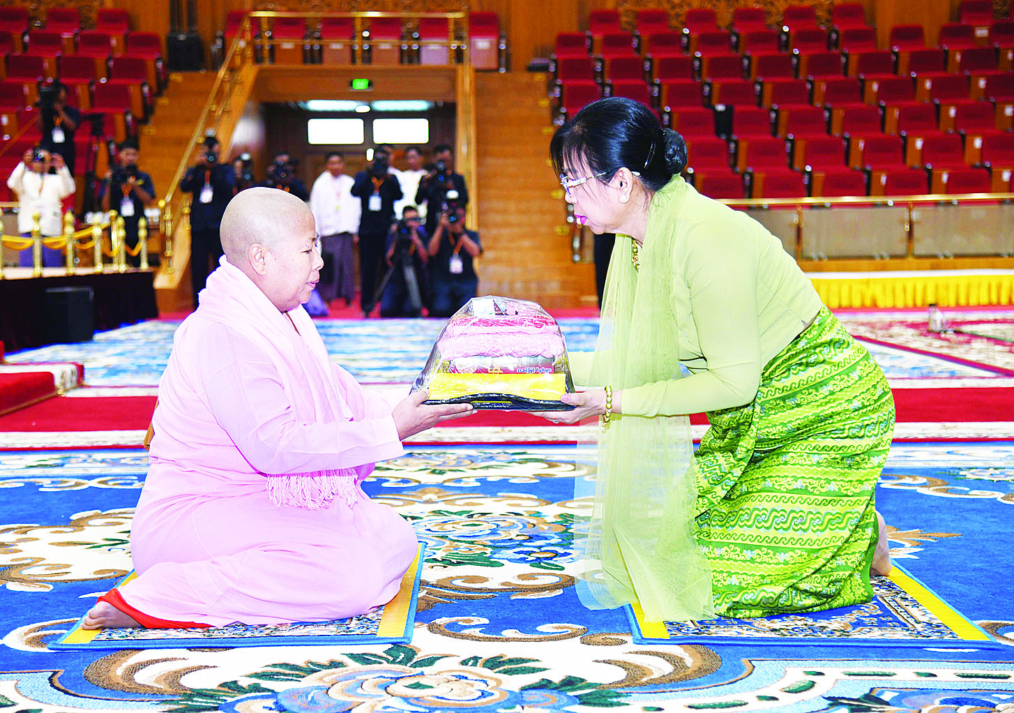 ဆက်လက်၍ နိုင်ငံတော်စီမံအုပ်ချုပ်ရေးကောင်စီဥက္ကဋ္ဌ နိုင်ငံတော်ဝန်ကြီးချုပ်၏ ဇနီးက ဘွဲ့တံဆိပ်တော် ဆက်ကပ်ခံယူမည့် သီလရှင်ဆရာကြီးများအား လှူဖွယ်ဝတ္ထုပစ္စည်းများကို ဆက်ကပ်လှူဒါန်းသည်။