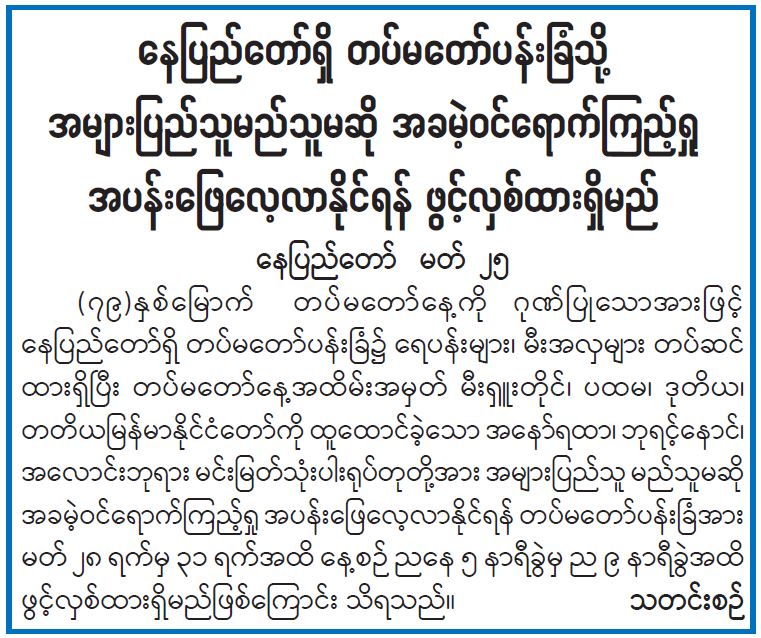 (၇၉)နှစ်မြောက် တပ်မတော်နေ့ကို ဂုဏ်ပြုသောအားဖြင့် နေပြည်တော်ရှိ တပ်မတော်ပန်းခြံ၌ ရေပန်းများ၊ မီးအလှများ တပ်ဆင် ထားရှိပြီး တပ်မတော်နေ့အထိမ်းအမှတ် မီးရှူးတိုင်၊ ပထမ၊ ဒုတိယ၊ တတိယမြန်မာနိုင်ငံတော်ကို ထူထောင်ခဲ့သော အနော်ရထာ၊ ဘုရင့်နောင်၊ အလောင်းဘုရား မင်းမြတ်သုံးပါးရုပ်တုတို့အား အများပြည်သူ မည်သူမဆို အခမဲ့ဝင်ရောက်ကြည့်ရှု အပန်းဖြေလေ့လာနိုင်ရန် တပ်မတော်ပန်းခြံအား မတ် ၂၈ ရက်မှ ၃၁ ရက်အထိ နေ့စဉ် ညနေ ၅ နာရီခွဲမှ ည ၉ နာရီခွဲအထိ ဖွင့်လှစ်ထားရှိမည်ဖြစ်ကြောင်း သိရသည်။