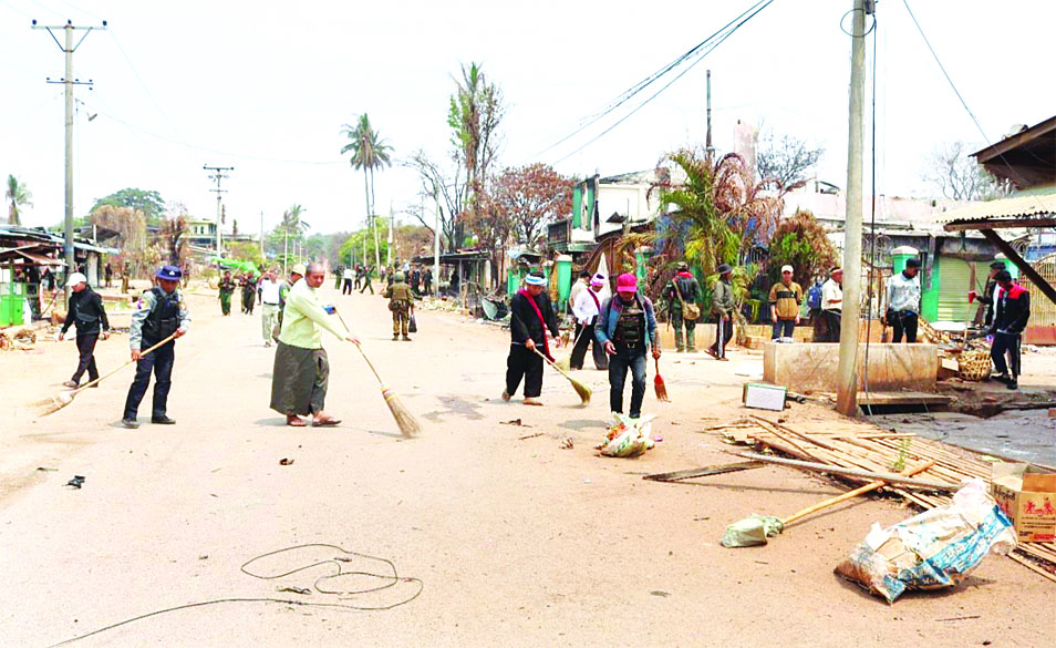 အဆိုပါဒေသများ တည်ငြိမ်အေးချမ်းရေးအတွက် လိုအပ်သည့်လုံခြုံရေးလုပ်ငန်းများကို နယ်မြေခံတပ်မတော်သားများက ပြည်သူ့စစ်(ဌာနေ)တပ်ဖွဲ့ဝင်များ၊ ဒေသခံပြည်သူများအားလုံးမှ ပူးပေါင်း၍ ၃၂ ရက်ကြာ အစွမ်းကုန် သောင်းကျန်းသူချေမှုန်းရေးအား ကြိုးပမ်းဆောင်ရွက်ခဲ့ရာ ယခုအခါ ပြန်လည်တည်ငြိမ် အေးချမ်းလာပြီဖြစ်သည့်အတွက် ယာယီနေရပ်စွန့်ခွာ ဒေသခံတိုင်းရင်းသားများသည် ၎င်းတို့၏ သက်ဆိုင်ရာကျေးရွာများသို့ ပြန်လည်အခြေချ ဝင်ရောက်နေထိုင်လျက်ရှိရာ နယ်မြေခံတပ်မတော်သားများက အကြမ်းဖက်သမားများ ဖျက်ဆီးသွားခဲ့သည့် မြို့၊ ရွာများ သန့်ရှင်းသာယာလှပရေးအတွက် မြန်မာနိုင်ငံရဲတပ်ဖွဲ့ဝင်များ၊ ဌာနဆိုင်ရာဝန်ထမ်းများ၊ ပြည်သူ့စစ်(ဌာနေ)တပ်ဖွဲ့ဝင်များ၊ ဒေသခံတိုင်းရင်းသားများနှင့်အတူ ပြန်လည်ထူထောင်ရေးလုပ်ငန်းများနှင့် စုပေါင်းသန့်ရှင်းရေးလုပ်ငန်းများကို ဝိုင်းဝန်းကူညီ ဆောင်ရွက်ပေးပြီး သက်ဆိုင်ရာတာဝန်ရှိသူများက ထောက်ပံ့ပစ္စည်းများနှင့် ထောက်ပံ့ငွေများပေးအပ်လျက်ရှိသည်။