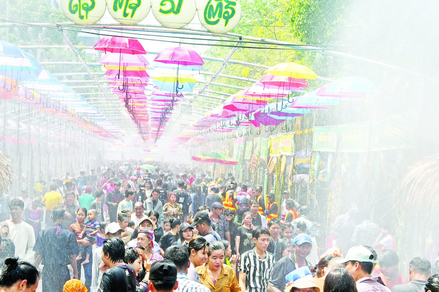 ရန်ကုန်လမ်းလျှောက်သင်္ကြန်မဏ္ဍပ်တွင် ရုပ်ရှင်၊ ဂီတအဖွဲ့မှအနုပညာရှင်များ၊ DJ အဖွဲ့တို့၏ ဖျော်ဖြေတင်ဆက်မှုနှင့်အတူ ရောင်စုံထီးမိုးအောက်၌ လမ်းလျှောက်ပွဲလာ သင်္ကြန်ချစ်သူပြည်သူများက ပျော်ရွှင်ကြည်နူးလျက်ရှိကြသည်။