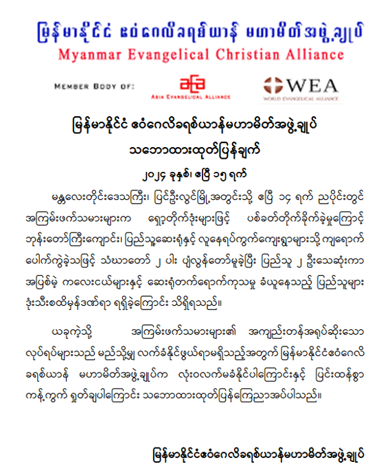 မြန်မာနိုင်ငံ ဧဝံဂေလိခရစ်ယာန်မဟာမိတ်အဖွဲ့ချုပ် သဘောထားထုတ်ပြန်ချက်