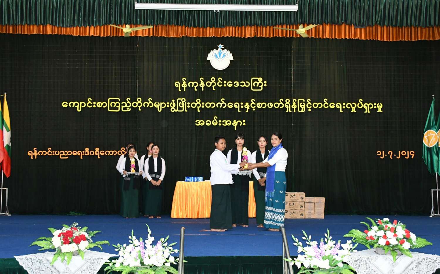 ဆက်လက်ပြီး ရန်ကင်းပညာရေးဒီဂရီကောလိပ်အတွက် ရန်ကုန်တိုင်းဒေသကြီးအစိုးရအဖွဲ့မှ လှူဒါန်းသော လက်သန့်ဆေးရည်များ၊ ဓာတ်ဆားထုပ်များနှင့် သုတ/ ရသစာအုပ် (၁၅၀) အုပ်တို့အား တိုင်းဒေသကြီးဝန်ကြီးချုပ်က ပေးအပ်ရာ ရန်ကင်းပညာရေးဒီဂရီကောလိပ်မှ ကျောင်းအုပ်ကြီး ဦးအောင်မြတ်စိုးက လက်ခံရယူခဲ့ပြီး ကျောင်းစာကြည့်တိုက်များဖွံ့ဖြိုးတိုးတက်ရေးအတွက် အလှူရှင်များက အလှူငွေများ ပေးအပ်လှူဒါန်းရာ တိုင်းဒေသကြီးအစိုးရအဖွဲ့ဝင်ဝန်ကြီးများက လက်ခံရယူခဲ့သည်။
