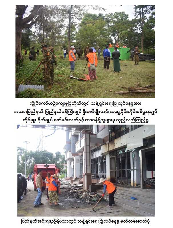 တပ်မတော်စစ်ကြောင်းများက လွိုင်ကော်မြို့နှင့် အနီးပတ်ဝန်းကျင်အတွင်း နယ်မြေလုံခြုံရေးဆောင်ရွက်ပြီးသည့်အချိန်၌ ဒေသခံပြည်သူများအပါအဝင် တပ်မတော်သားများ၊ မြန်မာနိုင်ငံရဲတပ်ဖွဲ့ဝင်များ၊ ဌာနဆိုင်ရာဝန်ထမ်းများက ပြန်လည်ထူထောင်ရေးလုပ်ငန်းများဆောင်ရွက်ခြင်း၊ စုပေါင်းသန့်ရှင်းရေးဆောင်ရွက်ပေးခြင်းတို့ကို အင်တိုက်အားတိုက် ဝိုင်းဝန်းဆောင်ရွက်ပေးလျက်ရှိရာ ယနေ့နံနက်ပိုင်းတွင် ကယားပြည်နယ် အစိုးရအဖွဲ့ဝန်ကြီးချုပ် ဦးဇော်မျိုးတင်နှင့် အရှေ့ပိုင်းတိုင်းစစ်ဌာနချုပ် တိုင်းမှူး ဗိုလ်ချုပ် ဇော်မင်းလတ်တို့က တာဝန်ရှိသူများနှင့်အတူ သွားရောက်ကြည့်ရှုအားပေးကာ လိုအပ်သည်များ ပေါင်းစပ်ညှိနှိုင်းဆောင်ရွက်ပေးသည်။