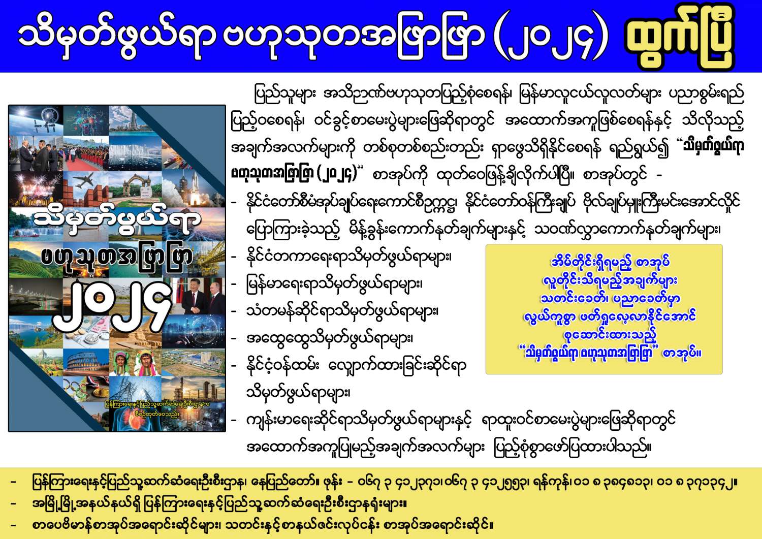 ပြန်ကြားရေးနှင့်ပြည်သူ့ဆက်ဆံရေးဦးစီးဌာနက စီစဉ်ထုတ်ဝေသည့် “သိမှတ်ဖွယ်ရာ ဗဟုသုတအဖြာဖြာ (၂၀၂၄)” စာအုပ်သည် ပြည်သူများ အသိဉာဏ်ဗဟုသုတပြည့်စုံစေရန်၊ ပြန်တမ်းဝင် အရာရှိအဆင့် (စတင်ခန့်) စာမေးပွဲများနှင့် အခြားဝင်ခွင့်စာမေးပွဲများဖြေဆိုရာတွင် အထောက်အကူဖြစ်စေရန်၊ သိရှိလိုသည့်အချက်အလက်များကို တစ်စုတစ်စည်းတည်း ရှာဖွေလေ့လာဖတ်ရှုနိုင်စေရန်ရည်ရွယ်၍ ၂၀၀၈ ခုနှစ်မှစတင်ကာ နှစ်စဉ်ထုတ်ဝေခဲ့သောစာအုပ်ဖြစ်ပါသည်။