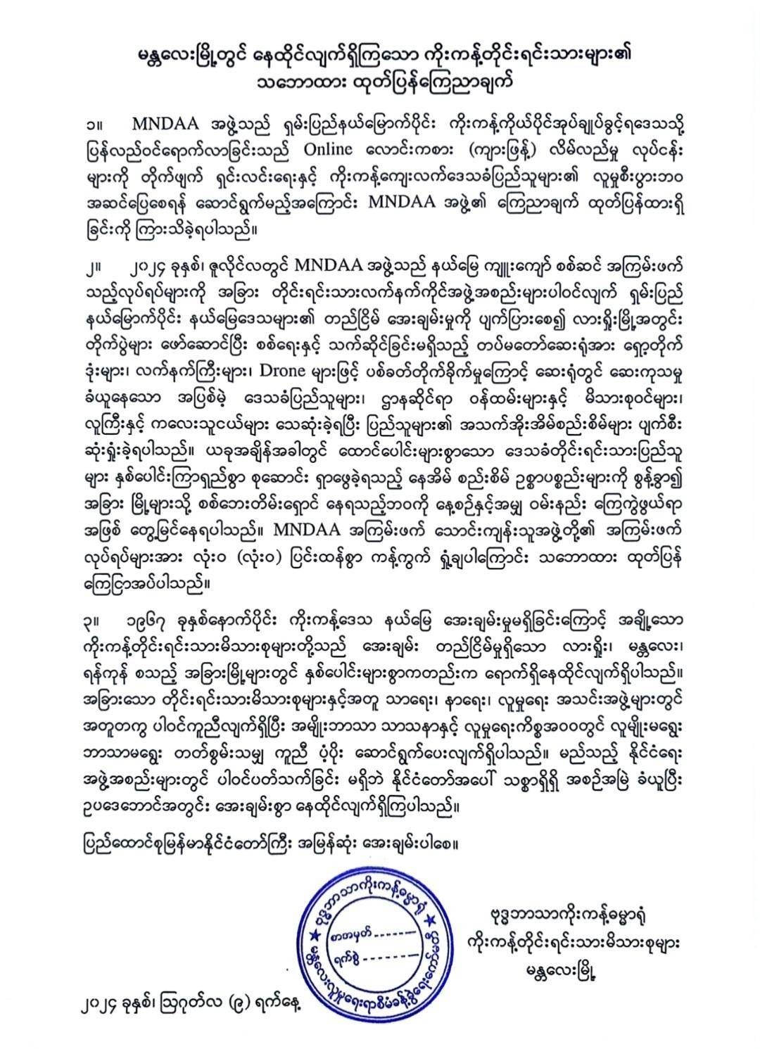 ထိုကဲ့သို့ MNDAA အကြမ်းဖက်သောင်းကျန်းသူအဖွဲ့၏ စစ်ရာဇဝတ်မှု (War Crime) မြောက်သည့် လူမဆန်စွာရက်စက်ယုတ်မာရိုင်းစိုင်းသော အကြမ်းဖက်လုပ်ရပ်များကို လုံးဝလက်မခံကြောင်းနှင့် ပြင်းထန်စွာကန့်ကွက်ရှုတ်ချကြောင်းကို မန္တလေးမြို့တွင် နေထိုင်လျက်ရှိသည့် ကိုးကန့်တိုင်းရင်းသားမိသားစုများက သဘောထားထုတ်ပြန်ခဲ့ကြောင်း သတင်းရရှိသည်။