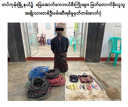 နေပြည်တော်ကောင်စီနယ်မြေ၊ တပ်ကုန်းမြို့နယ်၌ ဩဂုတ်လ ၁၉ ရက်နေ့က မြေအောက်ကေဘယ်မီးကြိုးများ ဖြတ်တောက်ခိုးယူသူ အမျိုးသားတစ်ဦးအားဖမ်းဆီးရမိခဲ့ကြောင်း သိရသည်။