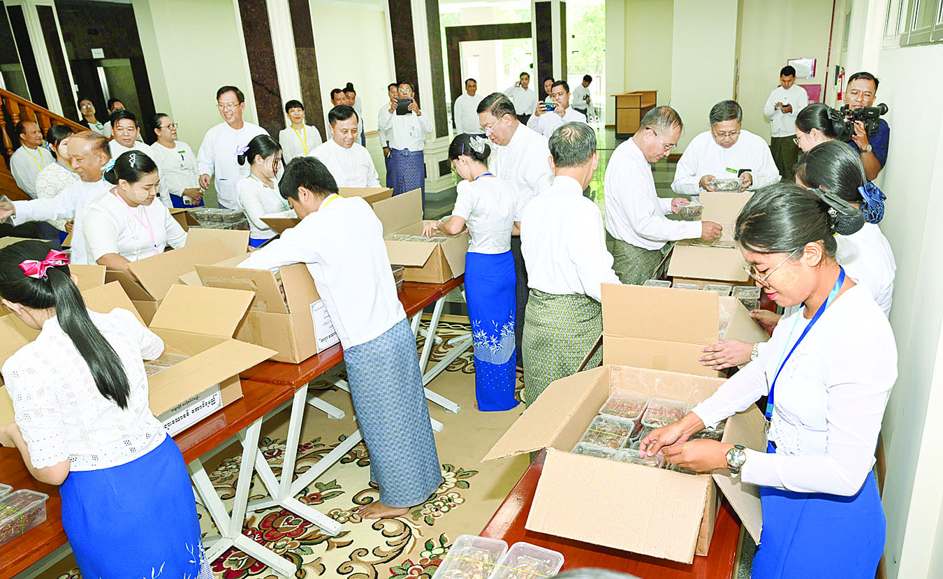 အမဲသားဘူး၊ ကြက်သားအာလူးဘူး၊ ငါးသလောက်ဘူး၊ ငါးတန်အချိုပေါင်းဘူးများ ပြင်ဆင်ထုပ်ပိုးနေမှုကို ကြည့်ရှုအားပေး