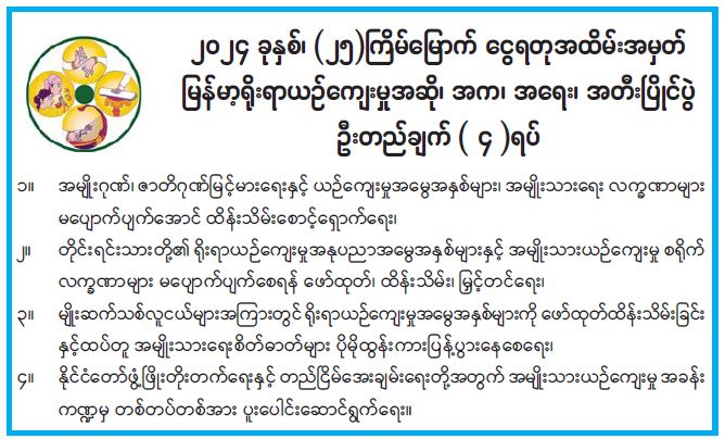 ၂၀၂၄ ခုနှစ်၊ (၂၅) ကြိမ်မြောက် ငွေရတုအထိမ်းအမှတ် မြန်မာ့ရိုးရာယဉ်ကျေးမှု အဆို၊ အက၊ အရေး၊ အတီးပြိုင်ပွဲ ဦးတည်ချက် (၄) ရပ် 08/26/2024