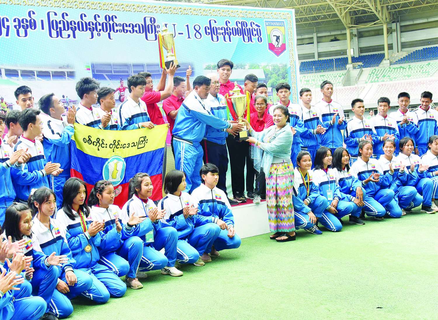 ဆက်လက်၍ နိုင်ငံတော်စီမံအုပ်ချုပ်ရေးကောင်စီအဖွဲ့ဝင် မန်းငြိမ်းမောင်က အမျိုးသမီးတံခွန်စိုက်ဆုဖလားရရှိသည့် ရှမ်းပြည်နယ်အသင်းကိုလည်းကောင်း၊ နိုင်ငံတော်စီမံအုပ်ချုပ်ရေးကောင်စီအဖွဲ့ဝင် ပိုးရယ်အောင်သိန်းက အမျိုးသားတံခွန် စိုက်ဆုဖလားရရှိသည့် စစ်ကိုင်းတိုင်းဒေသကြီးအသင်းကိုလည်းကောင်း၊ နိုင်ငံတော်စီမံအုပ်ချုပ်ရေးကောင်စီအဖွဲ့ဝင် ဒေါ်ဒွဲဘူက စုပေါင်းတံခွန်စိုက်ဆုဖလားရရှိသည့် စစ်ကိုင်းတိုင်းဒေသကြီးအသင်းကိုလည်းကောင်း တံခွန်စိုက်ဆုဖလားတို့ကို ပေးအပ်ချီးမြှင့်ခဲ့ကြသည်။
