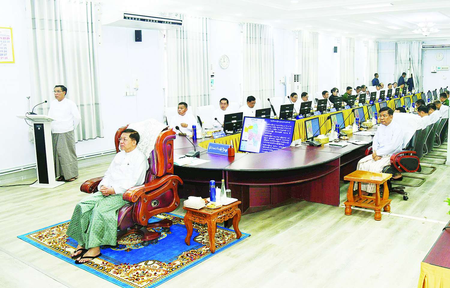 ယင်းနောက် မိမိနိုင်ငံတော်စီမံအုပ်ချုပ်ရေးကောင်စီအစိုးရအနေဖြင့် ၂၀၂ဝ ပြည့်နှစ် ပါတီစုံဒီမိုကရေစီအထွေထွေရွေးကောက်ပွဲတွင် ဖြစ်ပေါ်ခဲ့သည့် မဲမသမာမှုဖြစ်စဉ်များကို သင်ခန်းစာယူပြီး လာမည့်ရွေးကောက်ပွဲတွင် မဲစာရင်းများ မှန်ကန်မှုရှိစေရေးအတွက် မြေပြင်စာရင်းကောက်ယူခြင်းလုပ်ငန်းများအပါအဝင် လုပ်ငန်းစဉ်များအတိုင်း စနစ်တကျစီမံဆောင်ရွက်လျက်ရှိကြောင်း၊ မဲစာရင်းအချက်အလက်များ မှန်ကန်မှုရှိစေရေး လာမည့်အောက်တိုဘာလတွင် လူဦးရေနှင့်အိမ်အကြောင်းအရာ သန်းခေါင်စာရင်းကောက်ယူခြင်းလုပ်ငန်းများကို ဆောင်ရွက်သွားမည်ဖြစ်ကြောင်း၊ ထို့ကြောင့် အောက်တိုဘာလ ၁ ရက်နေ့မှစတင်၍ သန်းခေါင်စာရင်းကောက်ယူရာတွင် ပဲခူးတိုင်းဒေသကြီးအတွင်း ရာနှုန်းပြည့်ကောက်ယူနိုင်ရေး ဝိုင်းဝန်းကြိုးပမ်းဆောင်ရွက်သွားကြရန်လိုကြောင်း၊ စာရင်းဇယားများမှန်ကန်စွာရရှိစေရေး ဆောင်ရွက်ကြရန်လိုကြောင်း၊ ရွေးကောက်ပွဲကို စည်းစနစ်ကျနမှုရှိသည့် အထွေထွေရွေးကောက်ပွဲတစ်ရပ်ဖြစ်စေရေးနှင့် ၎င်းရွေးကောက်ပွဲမှ ထွက်ပေါ်လာသည့်အစိုးရကို နိုင်ငံတော်တာဝန်များ လွှဲအပ်နိုင်ရေး ဆက်လက်ဆောင်ရွက်သွားရမည်ဖြစ်ကြောင်း၊ သိက္ခာရှိသည့် ရွေးကောက်ပွဲနှင့် သိက္ခာရှိသည့် လွှတ်တော်အစည်းအဝေးကျင်းပနိုင်ရေး ဆောင်ရွက်ရမည်ဖြစ်ကြောင်း၊ လွှတ်တော်အသီးသီးတွင် အစည်းအဝေးအထမြောက်စေရေး၊ သိက္ခာရှိသည့် လွှတ်တော်အစည်းအဝေးဖြစ်စေရေးနှင့် သတ်မှတ်ကိုယ်စားလှယ်များ ရွေးချယ်တက်ရောက်နိုင်ရေး ဆောင်ရွက်သွားရမည်ဖြစ်ကြောင်း၊ အဆိုပါ လွှတ်တော်များတွင် သက်ဆိုင်ရာဒေသအလိုက် ပါဝင်သင့်သူများ ပါဝင်မှသာ လွှတ်တော်အတွင်း ကိုယ်စားပြုမှုများမည်ဖြစ်ကြောင်း၊ နိုင်ငံတော်၏ နိုင်ငံရေးဖြစ်ပေါ် ပြောင်းလဲမှုအခြေအနေများနှင့် လွတ်လပ်၍တရားမျှတသည့် ပါတီစုံဒီမိုကရေစီအထွေထွေရွေးကောက်ပွဲတစ်ရပ်အောင်မြင်စွာ ကျင်းပနိုင်ရေးဆောင်ရွက်လျက်ရှိသည့် အခြေအနေများကို သိရှိနိုင်ရန် ပြောကြားရခြင်းဖြစ်ကြောင်း။
