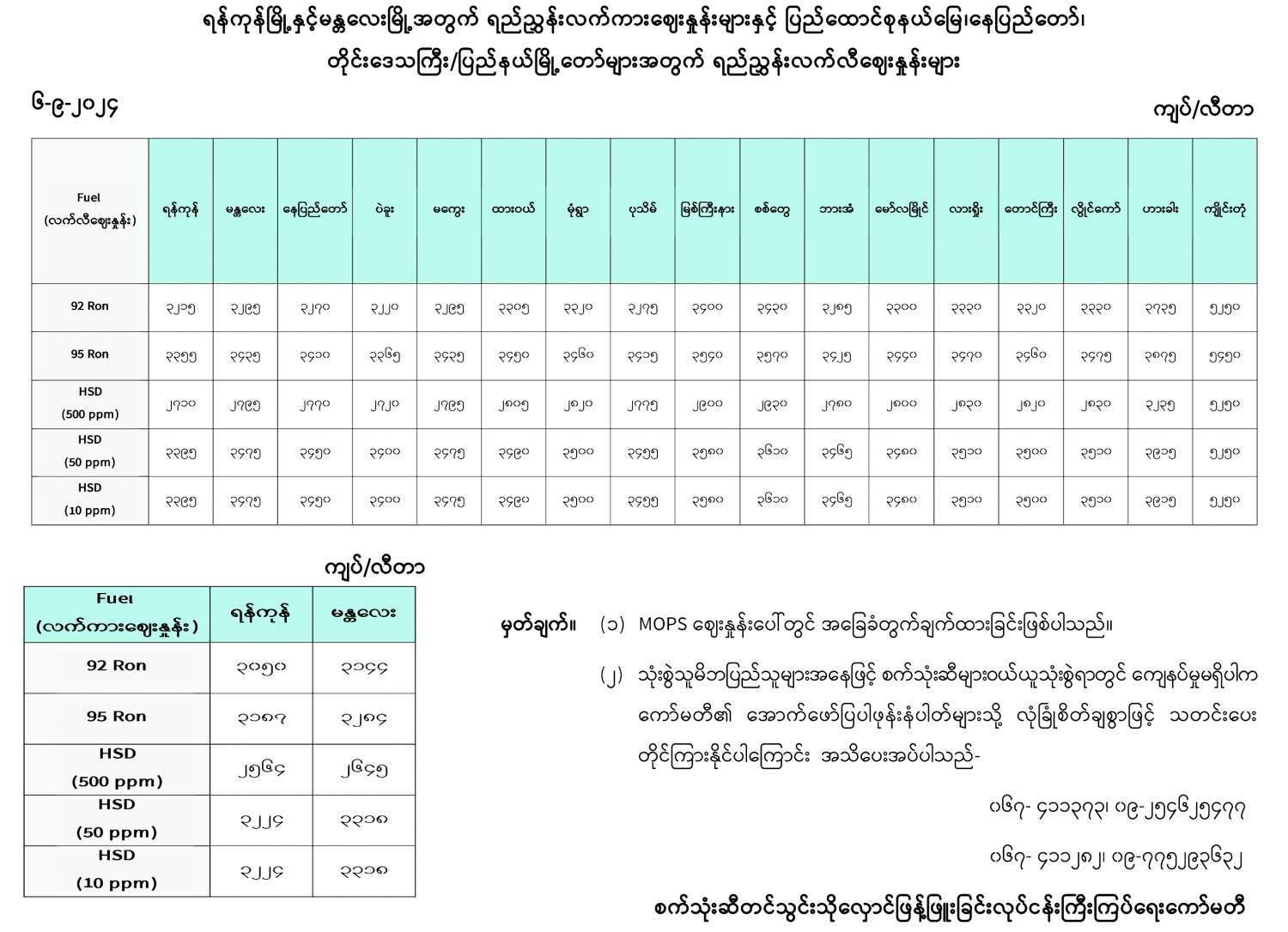 ရန်ကုန်မြို့နှင့် မန္တလေးမြို့အတွက် ရည်ညွှန်းလက်ကားဈေးနှုန်းများနှင့် ပြည်ထောင်စုနယ်မြေ နေပြည်တော်၊ တိုင်းဒေသကြီး/ပြည်နယ် မြို့တော်များအတွက် ရည်ညွှန်းလက်လီဈေးနှုန်းများ 09/06/2024