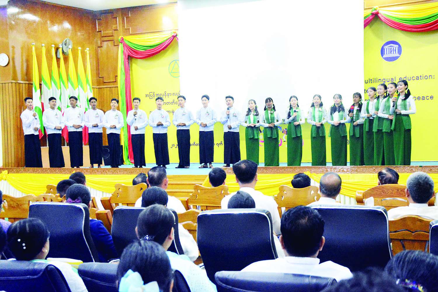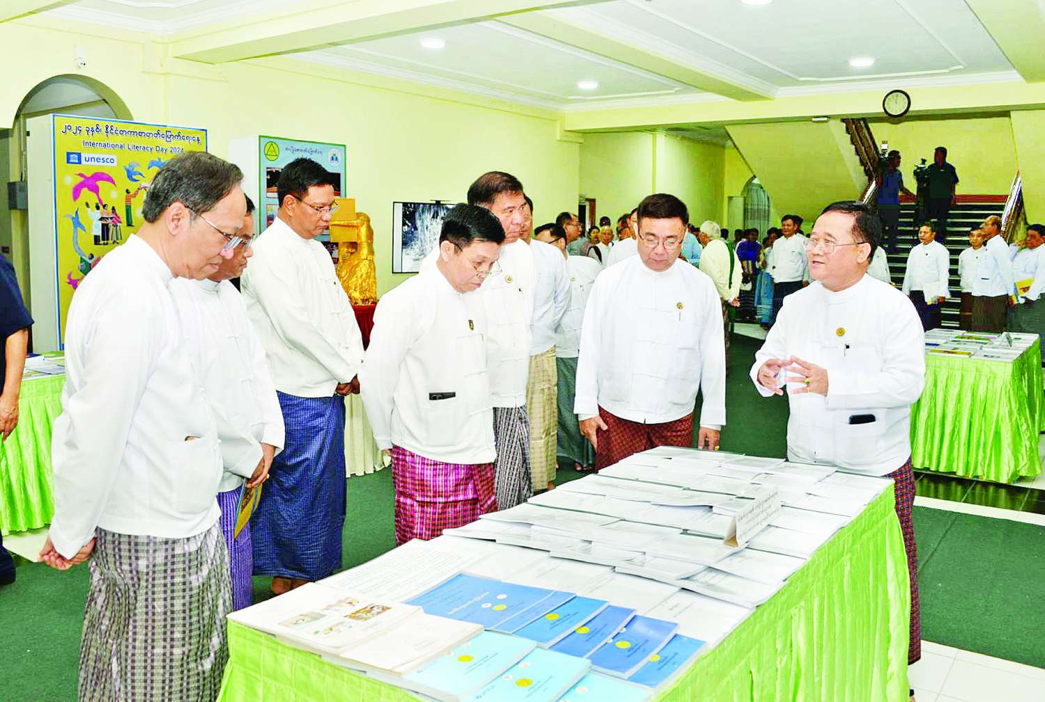 ၂၀၂၄ ခုနှစ် နိုင်ငံတကာ စာတတ်မြောက်ရေးနေ့ အခမ်းအနားကို ယနေ့နံနက်ပိုင်းတွင် နေပြည်တော်ရှိ ပညာရေးဝန်ကြီးဌာန ရုံးအမှတ်(၁၃)ရှိ အစည်းအဝေးခန်းမ၌ကျင်းပရာ ပြည်ထောင်စုဝန်ကြီးများ၊ ဒုတိယဝန်ကြီးများ၊ နေပြည်တော်ကောင်စီဝင်၊ အမြဲတမ်းအတွင်းဝန်များ၊ ညွှန်ကြားရေးမှူးချုပ်များ၊ မြန်မာနိုင်ငံယူနက်စကို အမျိုးသားကော်မရှင်မှ တာဝန်ရှိသူများ၊ ပညာရှင်အဖွဲ့များမှ ပညာရှင် ဆရာကြီး ဆရာမကြီးများ၊ ဌာနဆိုင်ရာများ၊ ဆရာ ဆရာမများ၊ ကျောင်းသား ကျောင်းသူများ၊ ဖိတ်ကြားထားသော ဧည့်သည်တော်များနှင့် တာဝန်ရှိသူများ တက်ရောက်ကြ သည်။