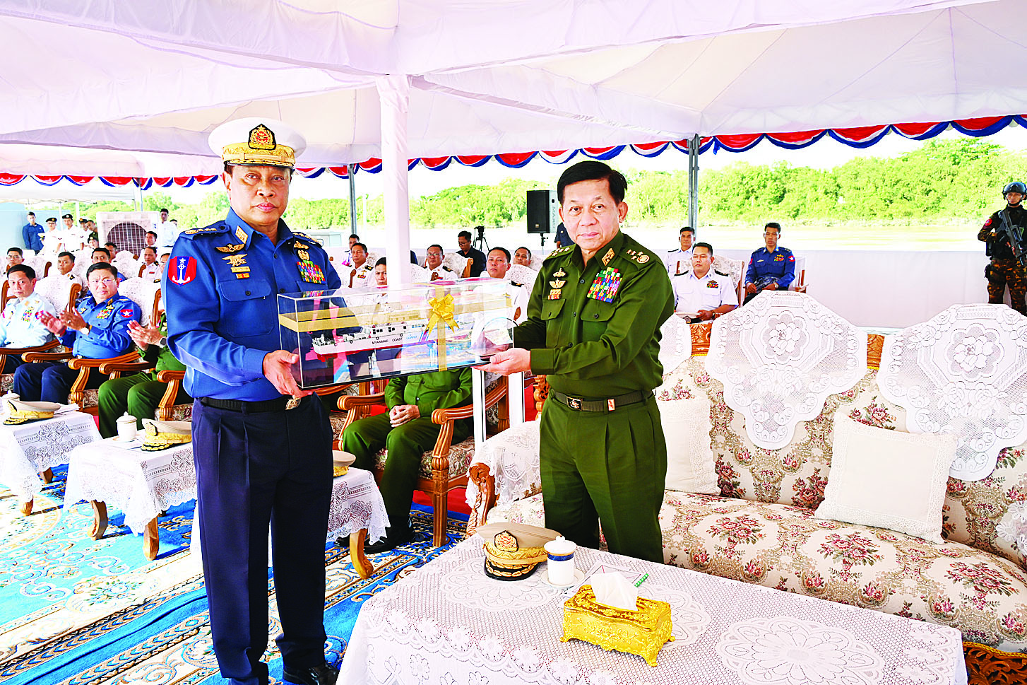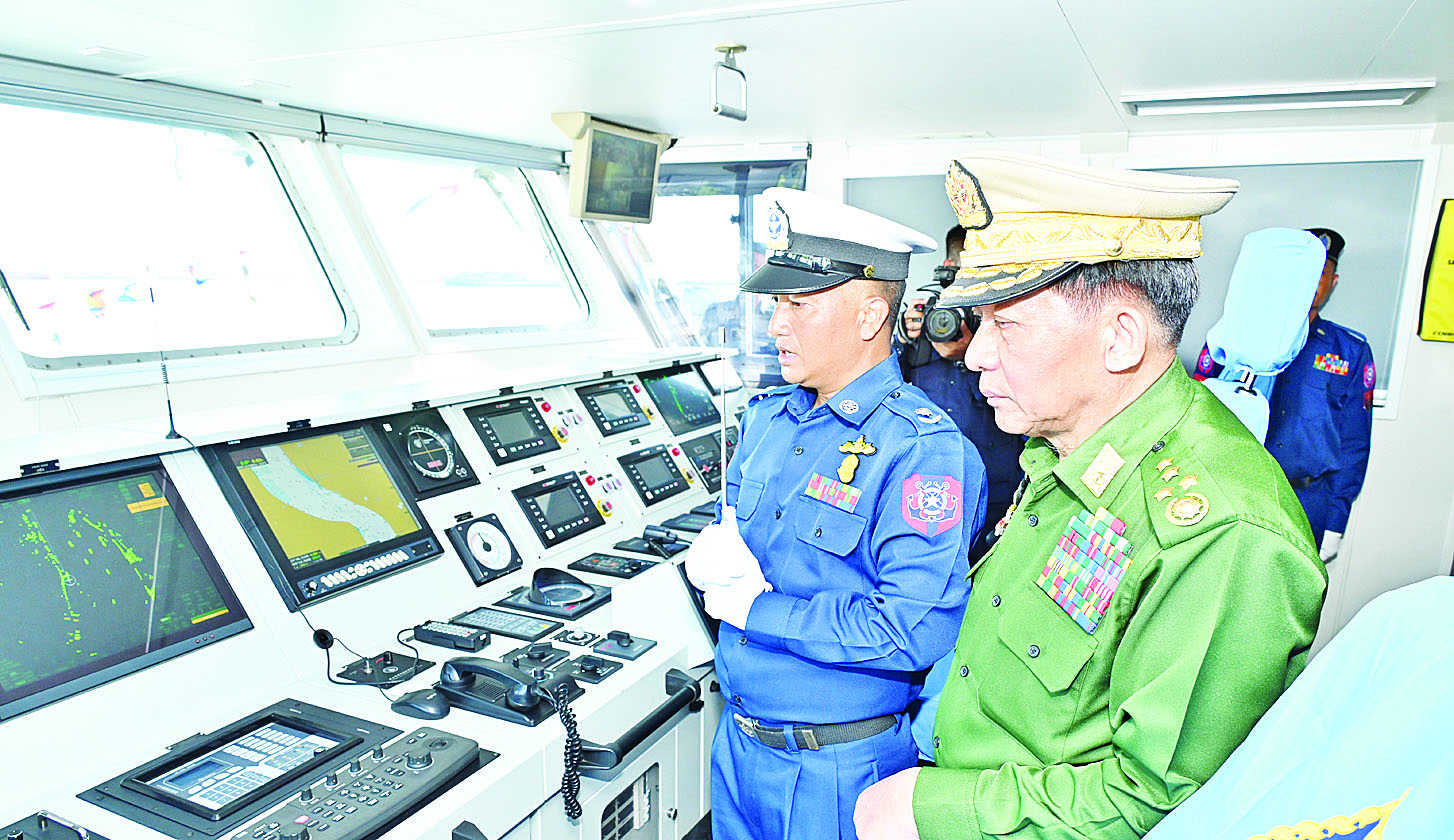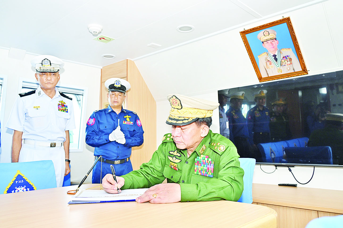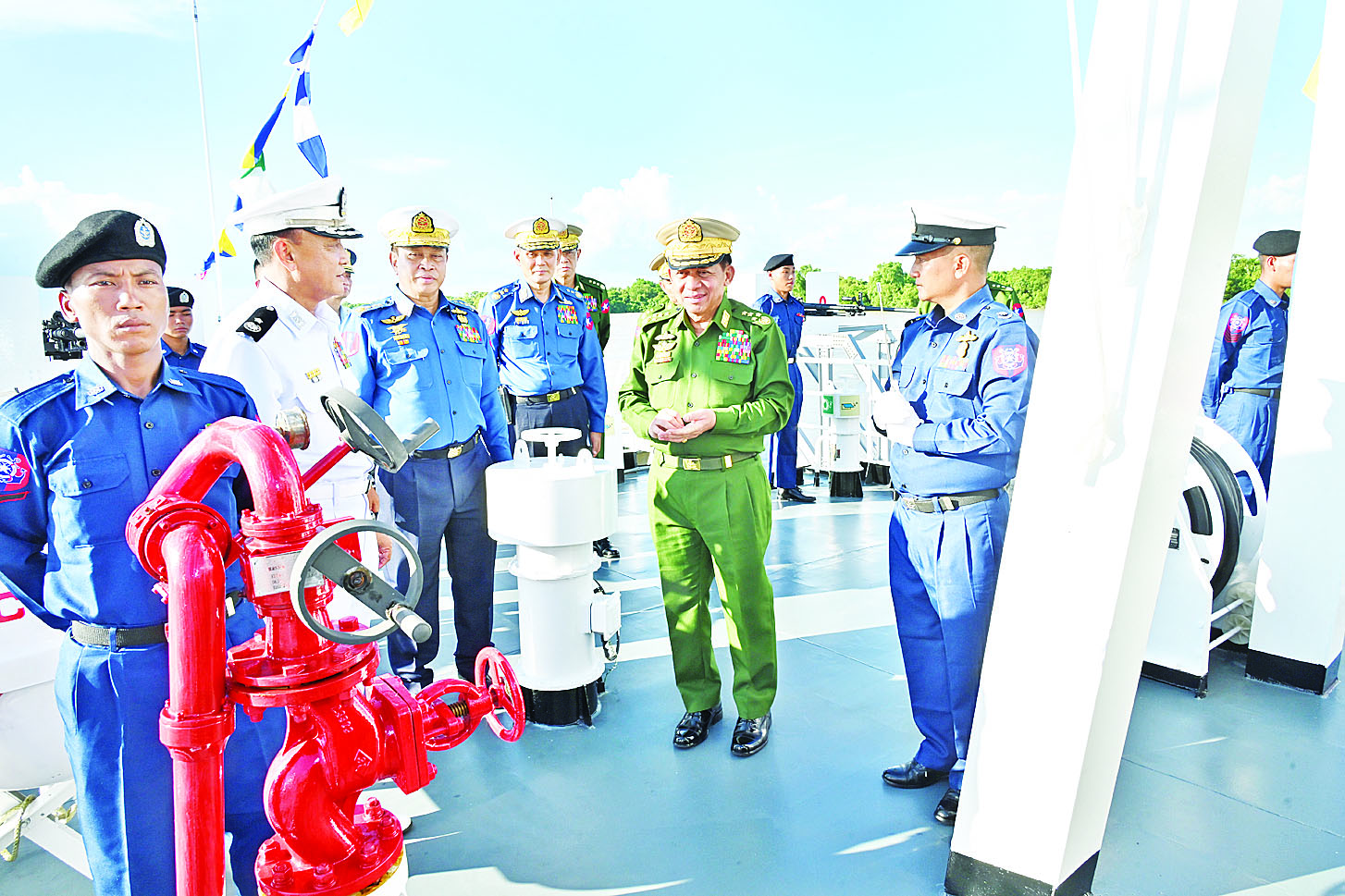 ယင်းနောက် နိုင်ငံတော်စီမံအုပ်ချုပ်ရေးကောင်စီဥက္ကဋ္ဌ တပ်မတော်ကာကွယ်ရေးဦးစီးချုပ်နှင့်အဖွဲ့ဝင်များသည် တပ်တော်ဝင်ရေယာဉ်များဖြစ်သော ၄၈ မီတာ အမြန်သွားကင်းလှည့်ရေယာဉ်(၄)စီးတို့အား လှည့်လည်ကြည့်ရှုကြရာ တာဝန်ရှိသူများက လိုက်လံရှင်းလင်းပြသကြသည်။ ၎င်းနောက် နိုင်ငံတော်စီမံအုပ်ချုပ်ရေးကောင်စီဥက္ကဋ္ဌ တပ်မတော်ကာကွယ်ရေးဦးစီးချုပ်သည် အမြန်သွားကင်းလှည့်ရေယာဉ်ပေါ်ရှိ ဧည့်သည်တော်မှတ်တမ်းတင်စာအုပ်တွင် မှတ်တမ်းတင်လက်မှတ်ရေးထိုးသည်။
