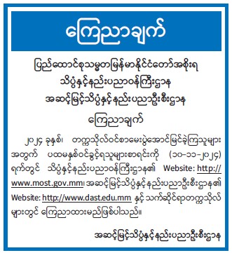 ၂၀၂၄ ခုနှစ်၊ တက္ကသိုလ်ဝင်စာမေးပွဲအောင်မြင်ခဲ့ကြသူများ အတွက် ပထမနှစ်ဝင်ခွင့်ရသူများစာရင်းကို (၁၀-၁၁-၂၀၂၄) ရက်တွင် သိပ္ပံနှင့်နည်းပညာဝန်ကြီးဌာန၏ Website: http://www.most.gov.mm၊ အဆင့်မြင့်သိပ္ပံနှင့်နည်းပညာဦးစီးဌာန၏ Website: http://www.dast.edu.mm နှင့် သက်ဆိုင်ရာတက္ကသိုလ်များတွင် ကြေညာထားမည်ဖြစ်ပါသည်။