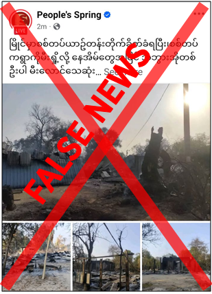 မကွေးတိုင်းဒေသကြီး၊ မြိုင်မြို့နယ်အတွင်း နယ်မြေလုံခြုံရေးဆောင်ရွက်လျက်ရှိသည့် လုံခြုံရေးတပ်ဖွဲ့ဝင်များက ဖေဖော်ဝါရီ ၁၉ ရက်တွင် ကျောက်ဆောက်ကျေးရွာကို မီးရှို့ဖျက်ဆီးခဲ့သည်ဟု တရားမဝင်ပြည်ဖျက်မီဒီယာများက သတင်းတု၊ သတင်းအမှားများ လုပ်ကြံရေးသား ဝါဒဖြန့်ဝေလျက်ရှိသည်ကို တွေ့ရှိရသည်။