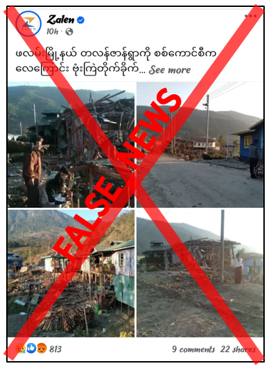 ချင်းပြည်နယ်၊ ဖလမ်းမြို့နယ်တွင် လုံခြုံရေးတပ်ဖွဲ့ဝင်များက လေကြောင်းတိုက်ခိုက်ခဲ့မှုကြောင့် ဘုရားကျောင်းနှင့် လူနေအဆောက်အအုံများပျက်စီးခဲ့ဟု တရားမဝင်ပြည်ဖျက်မီဒီယာများက မဟုတ်မမှန်လုပ်ကြံဝါဒဖြန့်ချိမှုများ လုပ်ဆောင်လျက်ရှိနေကြောင်း သိရသည်။