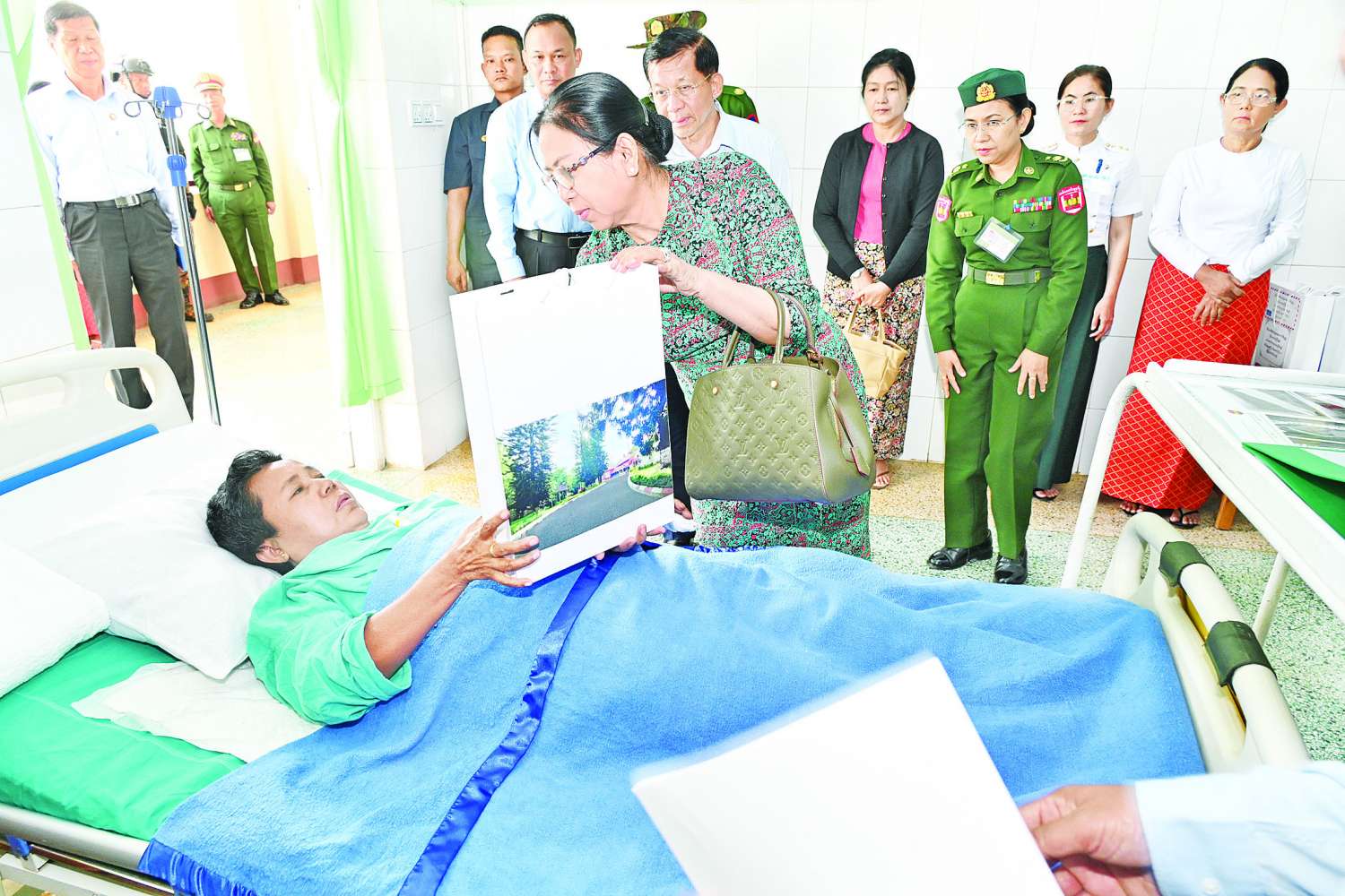 ယင်းနောက် နိုင်ငံတော်စီမံအုပ်ချုပ်ရေးကောင်စီဥက္ကဋ္ဌ နိုင်ငံတော်ဝန်ကြီးချုပ်နှင့်ဇနီး၊ အဖွဲ့ဝင်များသည် ဆေးရုံတက်ရောက်ကုသမှုခံယူလျက်ရှိသည့် အရာရှိ၊ စစ်သည်များအား ဂုဏ်ပြုချီးမြှင့်ငွေနှင့် လက်ဆောင်ပစ္စည်းများပေးအပ်သည်။