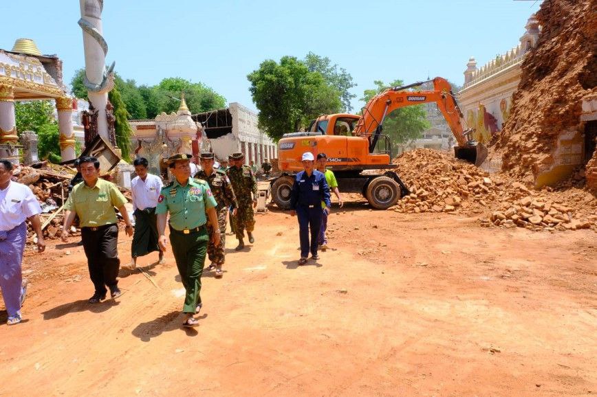ထိုသို့ ဆောင်ရွက်ပေးလျက်ရှိရာ ယနေ့တွင် ကာကွယ်ရေးဦးစီးချုပ်ရုံး(ကြည်း)မှ ဒုတိယဗိုလ်ချုပ်ကြီးသက်ပုံနှင့် တာဝန်ရှိသူများသည် စစ်ကိုင်းတောင်ရိုးရှိ ဆွမ်းဦးပုညရှင်စေတီနှင့် ဥမင်သုံးဆယ်စေတီတို့၌ ငလျင်ဒဏ်ကြောင့်ပြိုကျပျက်စီးလျက်ရှိသော သာသနိကအဆောက်အအုံများအား ရှင်းလင်းဖယ်ရှားနေမှုအခြေအနေများ စစ်ကိုင်းမြို့ သောတပန်ရပ်ကွက်ရှိ ငလျင်ဒဏ်ကြောင့် ပြိုကျပျက်စီးလျက်ရှိသော အောင်မြေဘုံစံကျောင်းတိုက် သာသနိကအဆောက်အဦများကို စက်ယန္တာရားကြီးများဖြင့် ဖယ်ရှားရှင်းလင်းနေမှုများနှင့် သံပုဏ္ဏာရာမကျောင်းတိုက် ကျောင်းပုရဝုဏ်အတွင်း ငလျင်ဘေးသင့် ရဟန်း၊ သံဃာ၊ သီလရှင်၊ ပြည်သူများအတွက် တပ်မတော်နယ်လှည့်ဆေးကုသရေးအဖွဲ့၏ ကျန်းမာရေးစောင့်ရှောက်ပေးနေမှုများကို ကြည့်ရှုအားပေးပြီး လိုအပ်သည်များ ညှိနှိုင်းဆောင်ရွက်ပေးသည်။