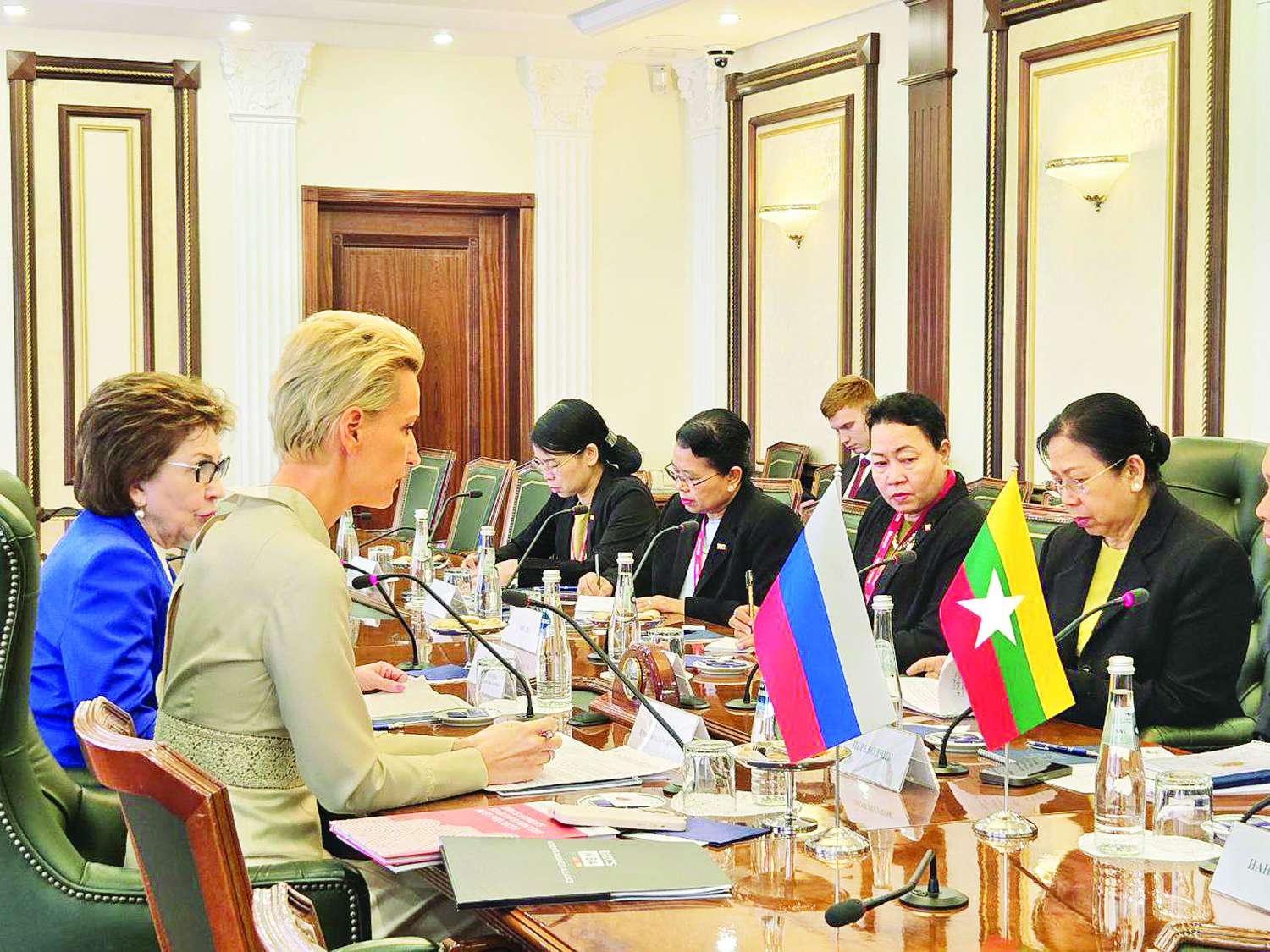 ထို့နောက် တွေ့ဆုံဆွေးနွေးရာတွင် နိုင်ငံတော်စီမံအုပ်ချုပ်ရေးကောင်စီဥက္ကဋ္ဌ နိုင်ငံတော်ဝန်ကြီးချုပ်၏ ဇနီးနှင့် BRICS အမျိုးသမီးစီးပွားရေးမဟာမိတ်အဖွဲ့ ရုရှားဖက်ဒရေးရှင်းနိုင်ငံဆိုင်ရာဥက္ကဋ္ဌတို့သည် မကြာမီပြုလုပ်မည့် BRICS Forum တွင် အစိုးရနှင့် စီးပွားရေးနယ်ပယ်ပေါင်းစုံမှ အမျိုးသမီးများပါဝင်သည့် အခြေအနေများ၊ BRICS အမျိုးသမီးစီးပွားရေးမဟာမိတ်အဖွဲ့ရုံးခွဲများကို ကမ္ဘာ့နိုင်ငံများတွင်ဖွင့်လှစ်ထားလျက်ရှိပြီး မြန်မာနိုင်ငံဘက်မှ စိတ်ဝင်စားပါက လာရောက်ဖွင့်လှစ်လိုသည့် အခြေအနေများ၊ လက်ရှိကမ္ဘာ့ရေးရာများတွင် အမျိုးသမီးများ၏အခန်းကဏ္ဍကို အသိအမှတ်ပြုအားပေးဆောင်ရွက်ရမည့်အချိန်သို့ ရောက်ရှိနေပြီဖြစ်သည့်အခြေအနေများ၊ အမျိုးသမီးများ၏ နေ့စဉ်လူမှုဘဝဆောင်ရွက်မှုများ သာမကကမ္ဘာ့ရေးရာကိစ္စရပ်များတွင် ရဲစွမ်းသတ္တိ၊ ယုံကြည်မှု၊ လုံ့လဝီရိယရှိမှု၊ ဦးဆောင်နိုင်မှု၊ ဖန်တီးနိုင်မှု စွမ်းအားတို့ဖြင့် လုပ်ကိုင်ဆောင်ရွက်နေမှုများအား အသိအမှတ်ပြုအားပေးရန် လိုအပ်သည့်အခြေအနေများ၊ မြန်မာနိုင်ငံအနေဖြင့် အမျိုးသမီးစွန့်ဦးတီထွင်မှုအခန်းကဏ္ဍ မြှင့်တင်ပေးနိုင်ရေးဆောင်ရွက်လျက်ရှိသည့် အခြေအနေများ၊ ရုရှား-မြန်မာနှစ်နိုင်ငံအကြား ပညာရေးနှင့်အမျိုးသမီးရေးရာတို့တွင် ပိုမိုပူးပေါင်းဆောင်ရွက်သွားနိုင်မည့် အခြေအနေများနှင့်ပတ်သက်၍ ရင်းနှီးပွင့်လင်းစွာ အမြင်ချင်းဖလှယ်ဆွေးနွေးကြသည်။
