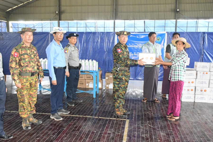 ဆက်လက်ပြီး ဒုတိယဗိုလ်ချုပ်ကြီး သက်ပုံနှင့် တာဝန်ရှိသူများသည် ပါရမီရပ်ကွက်ရှိ နှစ်(၇၀၀)ပြည့်အားကစားခန်းမ၌ ငလျင်ဒဏ်သင့်ပြည်သူများအတွက် လူမှုဝန်ထမ်း၊ ကယ်ဆယ်ရေးနှင့် ပြန်လည်နေရာချထားရေးဝန်ကြီးဌာန၊ ဘေးအန္တရာယ်ဆိုင်ရာစီမံခန့်ခွဲမှုဦးစီးဌာနက ဆန်ရိက္ခာဖိုး၊ အိမ်ဆောက်ပစ္စည်းဖိုး၊ သေဆုံး/ဒဏ်ရာရ မိသားစုဝင်များအတွက် ထောက်ပံ့ငွေကျပ် (၂၁,၃၆၅,၀၀၀)၊ အာဆီယံလူသားချင်းစာနာထောက်ထားမှုကူညီရေးညှိနှိုင်းမှုဗဟိုဌာန (AHA Center) က မီးဖိုချောင်းသုံးပစ္စည်းများနှင့် တရုတ်နိုင်ငံက တစ်ကိုယ်ရည်သုံးပစ္စည်းများ ထောက်ပံ့ပေးအပ်ပွဲသို့ တက်ရောက်၍ နိုင်ငံတော်ကထောက်ပံ့ပေးသော ငွေကြေးများ၊ ထောက်ပံ့ပစ္စည်းများ၊ ရိက္ခာများနှင့်ပတ်သက်ပြီး အသေးစိတ်ရှင်းလင်းပြောကြားပြီး ပြည်သူများလက်ဝယ်သို့အရောက် ထောက်ပံ့ပေးအပ်သည်။ ထို့နောက် ငလျင်ဘေးဒဏ်သင့်ပြည်သူများအတွက် အိမ်ဆောက်ပစ္စည်းအရောင်းပြခန်း၌ ပြည်သူများ စည်ကားသိုက်မြိုက်စွာ ဝယ်ယူနေမှုတို့ကို ကြည့်ရှုအားပေးပြီး လိုအပ်သည်များ ပေါင်းစပ်ညှိနှိုင်းဆောင်ရွက်ပေးသည်။