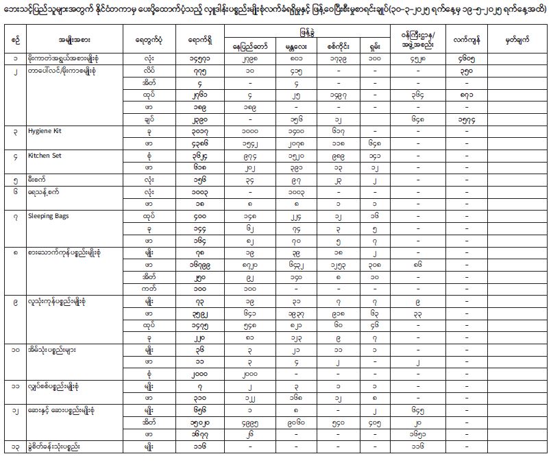 နိုင်ငံတကာအလှူရှင်များက ၁၃-၅-၂၀၂၅ ရက် နေ့မှ ၁၉-၅-၂၀၂၅ ရက်နေ့အထိ ရက်သတ္တပတ် ၁ ပတ်အတွင်း ပေးပို့လှူဒါန်းသည့် ပစ္စည်းများကို ဘေးသင့်ပြည်သူများအတွက် ဖြန့်ခွဲပေးပို့နိုင်ရေး ဆောင်ရွက်ထားမှုကို ပူးတွဲပါဇယားများဖြင့် ဖော်ပြအပ်ပါသည်။ ထပ်မံလှူဒါန်းလာသည့် ပစ္စည်းများရောက်ရှိမှုနှင့် ငလျင်ဘေးသင့်ပြည်သူများထံ အမြန်ဆုံးရောက်ရှိဖြန့်ခွဲမှုတို့ကို ၁ ပတ်လျှင် ၁ ကြိမ် ဆက်လက်သတင်းထုတ်ပြန်သွားမည်ဖြစ်ကြောင်း သတင်းထုတ်ပြန်အပ်ပါသည်။