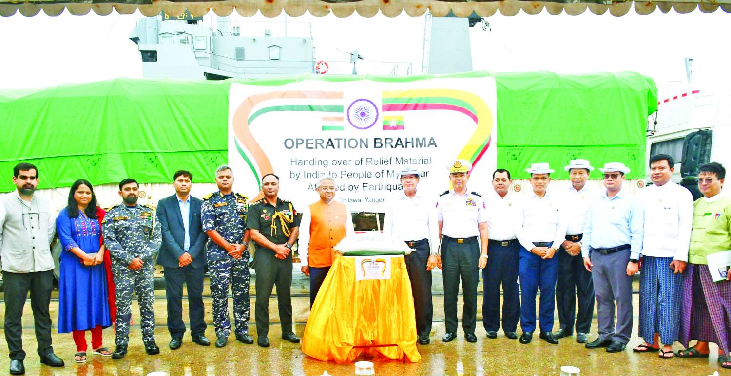 ထိုသို့ ရောက်ရှိလာသည့် ဘိလပ်မြေတန်ချိန် ၂၂၅ တန် (၅၀ ကီလိုရှိ အိတ် ၄၅၀၀)အား ယနေ့ညနေပိုင်းက လွှဲပြောင်းလက်ခံခြင်းအခမ်းအနားကို သီလဝါဆိပ်ကမ်း၌ကျင်းပရာ မြန်မာနိုင်ငံဆိုင်ရာ အိန္ဒိယသံအမတ်ကြီး H.E. Mr. Abhay Thakur က ဘိလပ်မြေအိတ်များ လှူဒါန်းပေးအပ်ရခြင်းနှင့် ပတ်သက်၍ ရှင်းလင်းပြောကြားပြီး ရန်ကုန်တိုင်းဒေသကြီး ဝန်ကြီးချုပ် ဦးစိုးသိန်း၊ တိုင်းဒေသကြီးဝန်ကြီးများ၊ နိုင်ငံခြားရေးဝန်ကြီး ဌာန၊ မဟာဗျူဟာလေ့လာရေးနှင့် လေ့ကျင့်ရေးဦးစီးဌာနမှ တာဝန်ရှိသူများ၊ လူမှုဝန်ထမ်း၊ ကယ်ဆယ်ရေးနှင့် ပြန်လည်နေရာချထားရေးဝန်ကြီးဌာန၊ ဘေးအန္တရာယ်ဆိုင်ရာ စီမံခန့်ခွဲမှုဦးစီးဌာနမှ တာဝန်ရှိသူများ၊ သန်လျင်ခရိုင် စီမံအုပ်ချုပ်ရေးအဖွဲ့ဥက္ကဋ္ဌနှင့် အဖွဲ့ဝင်များ၊ ကျောက်တန်း မြို့နယ်စီမံအုပ်ချုပ်ရေးအဖွဲ့ဥက္ကဋ္ဌနှင့် အဖွဲ့ဝင်များ၊ တာဝန်ရှိသူများက မြန်မာနိုင်ငံဆိုင်ရာ အိန္ဒိယသံအမတ်ကြီး H.E. Mr. Abhay Thakur ထံမှ လွှဲပြောင်းလက်ခံခဲ့သည်။