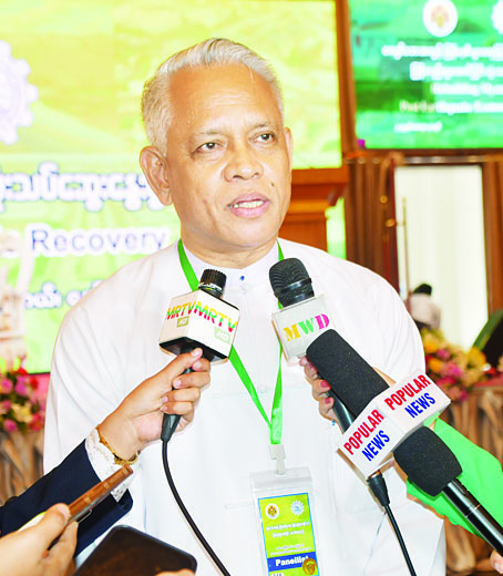 ကမ္ဘာမှာလည်း လက်ရှိမှာ ပထဝီနိုင်ငံရေး ပြောပြော၊ ပထဝီစီးပွားရေး ပြောပြော ပြောင်းလဲမှုတွေ၊ စိန်ခေါ်မှုတွေ အများကြီးနဲ့ ရင်ဆိုင်နေရတယ်။ ကျွန်တော်တို့လည်း ကြုံနေရတယ်။ ပိုဆိုး တာက ကျွန်တော်တို့က သဘာဝဘေးကိုပါ ဆိုးရွားစွာရင်ဆိုင်ခဲ့ရတယ်။ ဒါကြောင့် အများကြီးကျော်ဖြတ်ကြရမယ်။ ဒါကို အစိုးရ၊ ပုဂ္ဂလိက၊ ပြည်သူသုံးဖက်စလုံးက ပူးပေါင်းအဖြေရှာပြီး ဆောင်ရွက်ရမယ်။ မြေပြင်မှာ အမှန်တကယ်အသုံးပြုလို့ရမယ့်၊ လက်တွေ့ကျမယ့် အချက်တွေကို ဆွေးနွေးပေးကြဖို့လိုတယ်။ ဒီဖိုရမ်က စီးပွားရေး ပြန်နာလန်ထူနိုင်ဖို့ ဖြစ်သင့်တဲ့ အစီအမံတွေ ချမှတ်နိုင်ဖို့ ဆွေးနွေးဖော်ထုတ်ကြဖို့ အားလုံးကိုလည်း တိုက်တွန်းပါတယ်။ ပျက်စီးထိခိုက်မှုတွေမှာ သိရှိရသလောက် ရိုးရာရက်ကန်းလို အထည်လုပ်ငန်းတွေ အများကြီးထိခိုက်တာတွေ့ရတယ်။ ကျွန်တော်တို့ ပြန်လည် ကုစားတဲ့နေရာမှာ ပုဂ္ဂလိကကဏ္ဍ အားလုံးကို လွှမ်းခြုံနိုင်ဖို့လိုအပ်တယ်။ အဲဒီအတွက် မူဝါဒပိုင်းတွေ ပြောင်းလဲချမှတ်ပေးဖို့ လိုအပ်သလို ပုဂ္ဂလိကကလည်း ပူးပေါင်းပေးကြဖို့ တိုက်တွန်းပါတယ်။