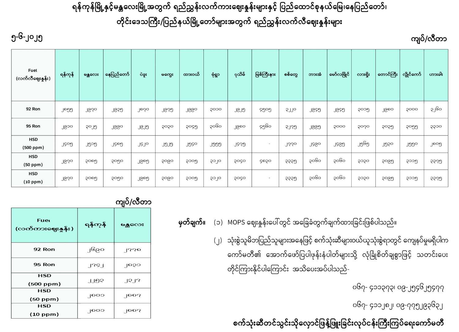 ရန်ကုန်မြို့နှင့် မန္တလေးမြို့အတွက် ရည်ညွှန်းလက်ကားဈေးနှုန်းများနှင့် ပြည်ထောင်စုနယ်မြေ နေပြည်တော်၊ တိုင်းဒေသကြီး/ပြည်နယ် မြို့တော်များအတွက် ရည်ညွှန်းလက်လီဈေးနှုန်းများ 06/05/2025