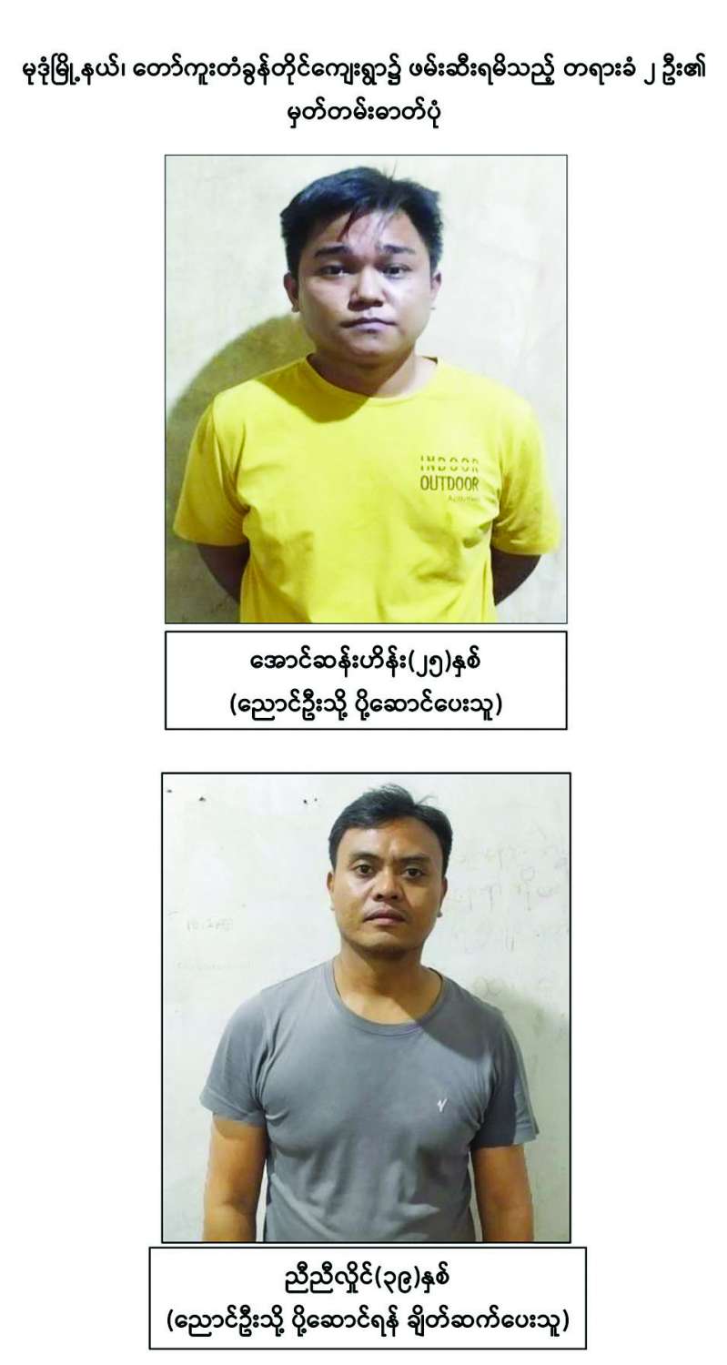 ဖမ်းဆီးရမိတရားခံများ၏ ထွက်ဆိုချက်အရ မေ ၂၅ ရက်တွင် ဦးချိုထွန်းအောင်အား လုပ်ကြံသတ်ဖြတ်ခဲ့ပြီး ထွက်ပြေးတိမ်းရှောင်နေသည့် တရားခံမျိုးကိုကို(ခ)စိုင်းကိုကို(ခ) ဇင်မင်းထက်(ခ)လင်း လက်ဇော်(၂၈)နှစ်၊ ၎င်း၏ဇနီးဖြစ်သူ ပြုံးပြုံး(၂၄)နှစ်၊ သမီးဖြစ်သူလင်းလက်ရွှေ (၆)နှစ်တို့အား ညောင်ဦးမြို့နယ် ပုဂံမြို့ဟောင်းတွင်လည်းကောင်း၊ ၎င်းတို့အား လိုက်ပါပို့ဆောင်ပေးခဲ့သည့် ယာဉ်မောင်း အောင်ဆန်းဟိန်း(၂၅)နှစ်နှင့် ချိတ်ဆက်ဆောင်ရွက်ပေးသူ ညီညီလှိုင်(၃၉)နှစ်တို့အား မွန်ပြည်နယ် မုဒုံမြို့တွင်လည်းကောင်း အသီးသီးဖမ်းဆီးရမိ ခဲ့သည်။