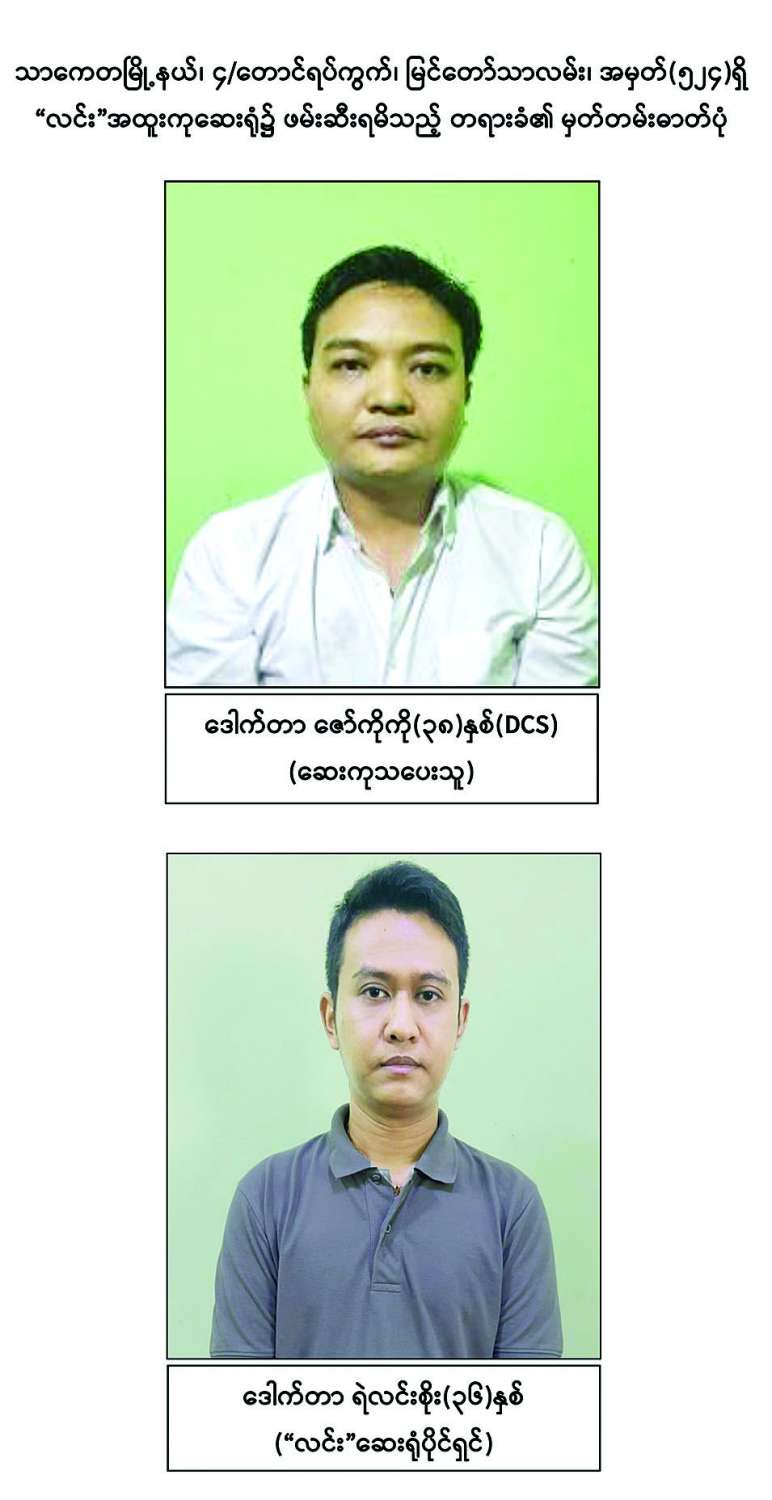 ထို့ပြင် ဖမ်းဆီးရမိတရားခံ မျိုးကိုကို(ခ)စိုင်းကိုကို(ခ)ဇင်မင်းထက်(ခ)လင်းလက်ဇော်၏ ထွက်ဆိုချက်အရ ၎င်းသည် ဦးချိုထွန်းအောင်အား လုပ်ကြံသတ်ဖြတ်စဉ် သေနတ်ကျည်ပေါက်ထွက်၍ ဘယ်ဘက်ခြေထောက် ဒဏ်ရာရရှိခဲ့ပြီး အဆိုပါဒဏ်ရာအား သာကေတမြို့နယ် ၄/တောင်ရပ်ကွက် မြင်တော်သာလမ်း အမှတ်(၅၂၄)ရှိ "လင်း" အထူးကုဆေးရုံ၌ လျှို့ဝှက်စွာ ဆေးကုသခဲ့ကြောင်း သိရှိရသဖြင့် မေ ၂၆ ရက် ညနေပိုင်းတွင် တရားမဝင်ဆေးကုသပေးခဲ့သော DCS ဆရာဝန် ဇော်ကိုကို(၃၈)နှစ်နှင့် DCS ဆရာဝန်များဖြင့် စုစည်းဖွင့်လှစ်ထားသည့် "လင်း" အထူးကုဆေးရုံပိုင်ရှင် ဒေါက်တာရဲလင်းစိုး(၃၆)နှစ်တို့အား ဖမ်းဆီးရမိခဲ့သည်။