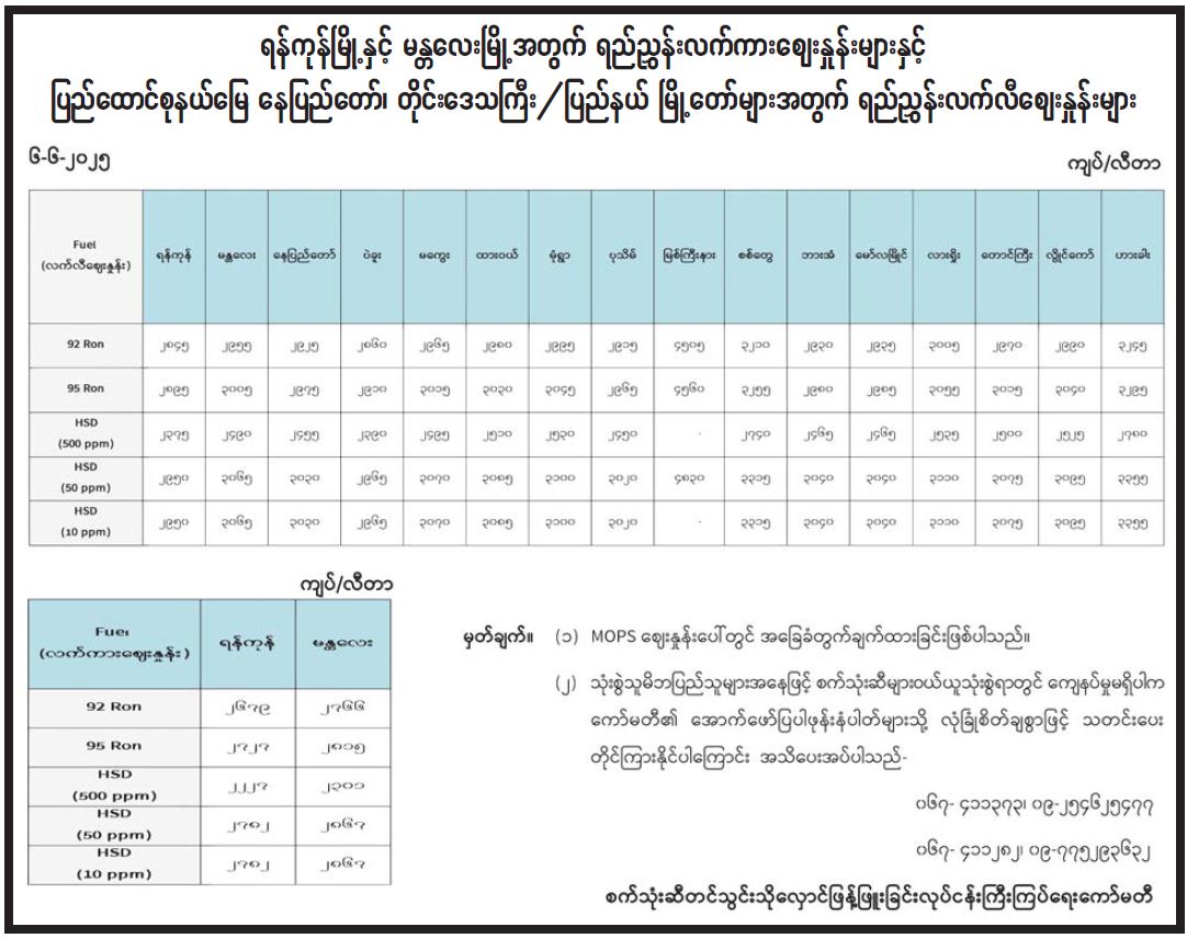 ရန်ကုန်မြို့နှင့် မန္တလေးမြို့အတွက် ရည်ညွှန်းလက်ကားဈေးနှုန်းများနှင့် ပြည်ထောင်စုနယ်မြေ နေပြည်တော်၊ တိုင်းဒေသကြီး/ ပြည်နယ် မြို့တော်များအတွက် ရည်ညွှန်းလက်လီဈေးနှုန်းများ 06/06/2025