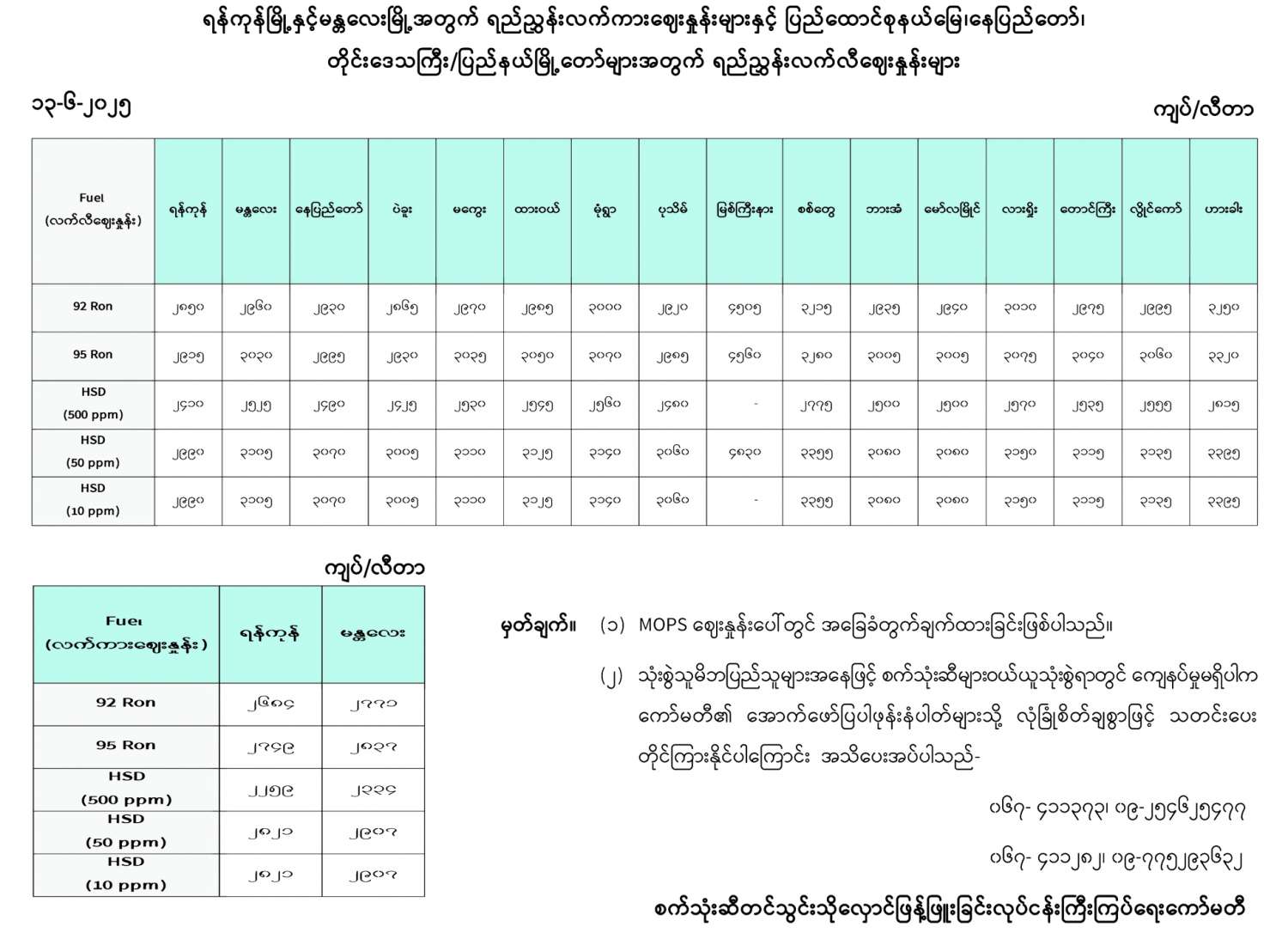 ရန်ကုန်မြို့နှင့် မန္တလေးမြို့အတွက် ရည်ညွှန်းလက်ကားဈေးနှုန်းများနှင့် ပြည်ထောင်စုနယ်မြေ နေပြည်တော်၊ တိုင်းဒေသကြီး/ပြည်နယ် မြို့တော်များအတွက် ရည်ညွှန်းလက်လီဈေးနှုန်းများ 06/13/2025