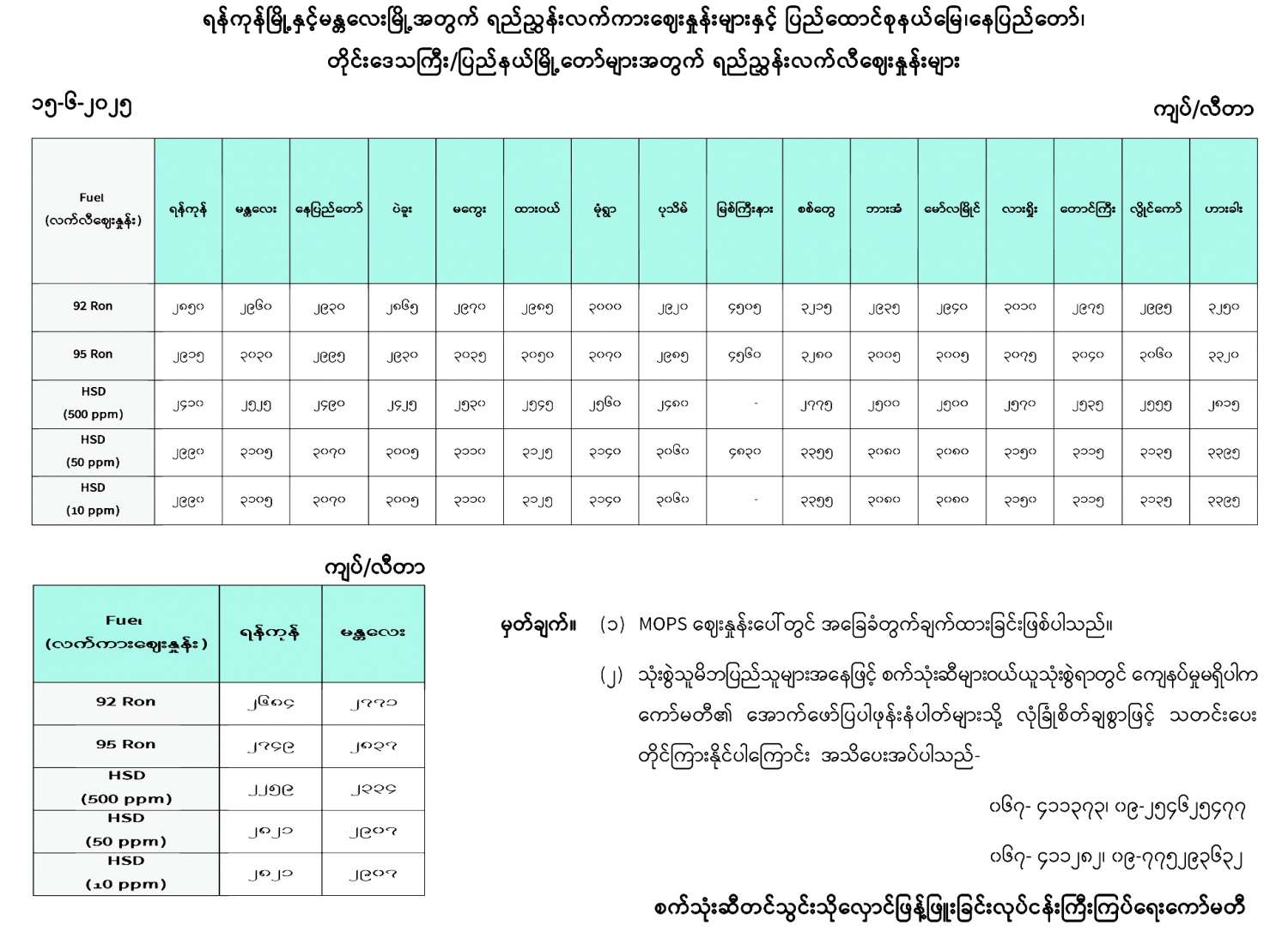 ရန်ကုန်မြို့နှင့် မန္တလေးမြို့အတွက် ရည်ညွှန်းလက်ကားဈေးနှုန်းများနှင့် ပြည်ထောင်စုနယ်မြေ နေပြည်တော်၊ တိုင်းဒေသကြီး/ပြည်နယ် မြို့တော်များအတွက် ရည်ညွှန်းလက်လီဈေးနှုန်းများ 06/15/2025
