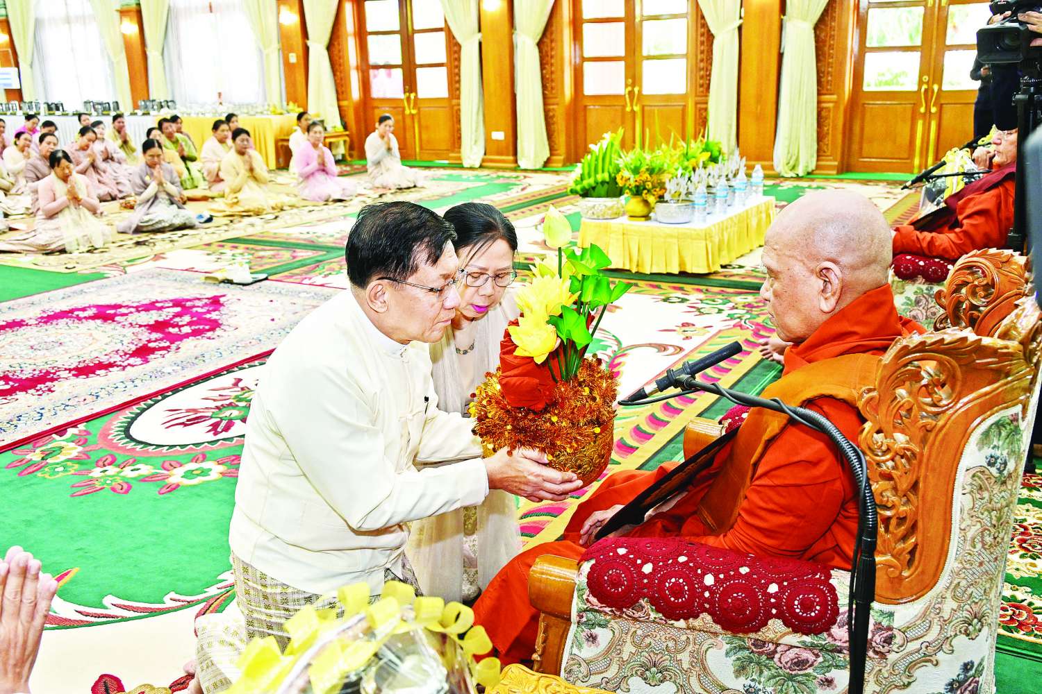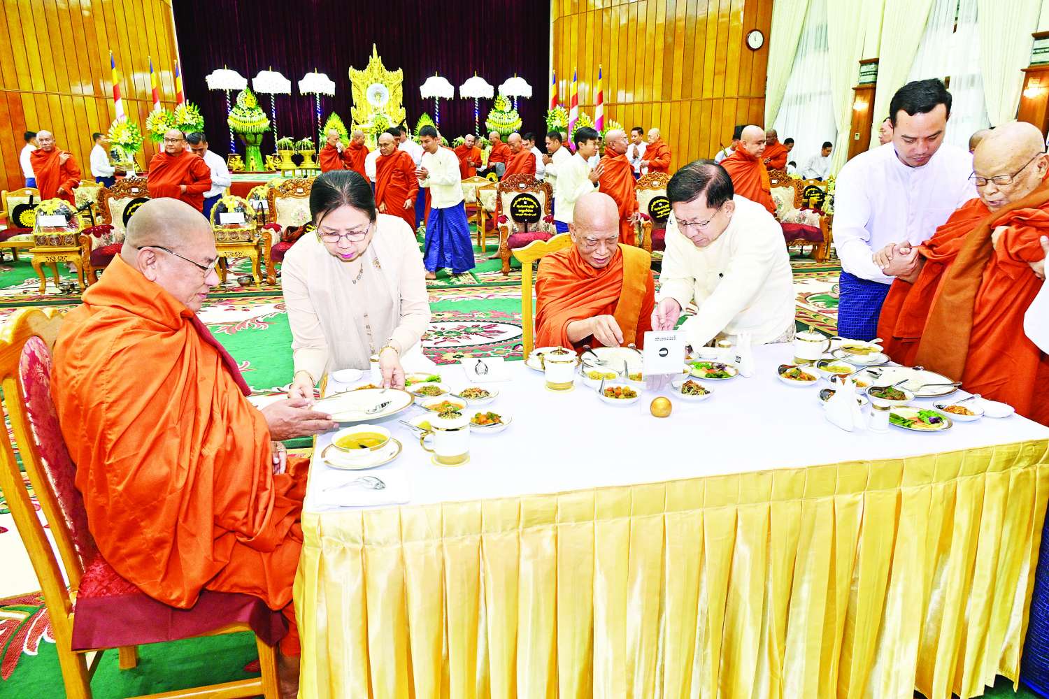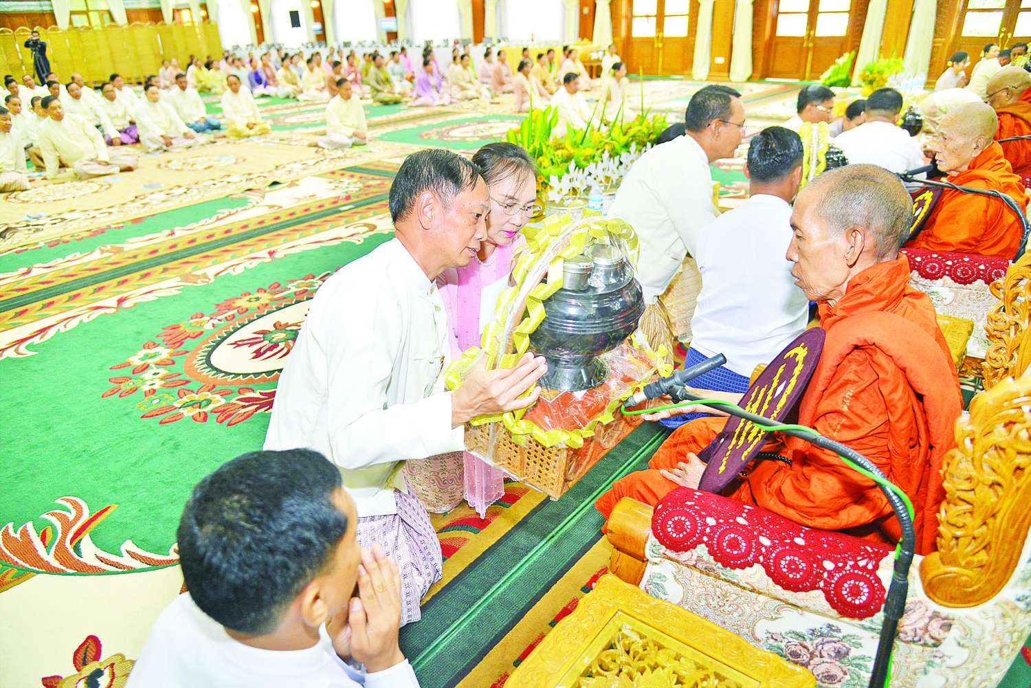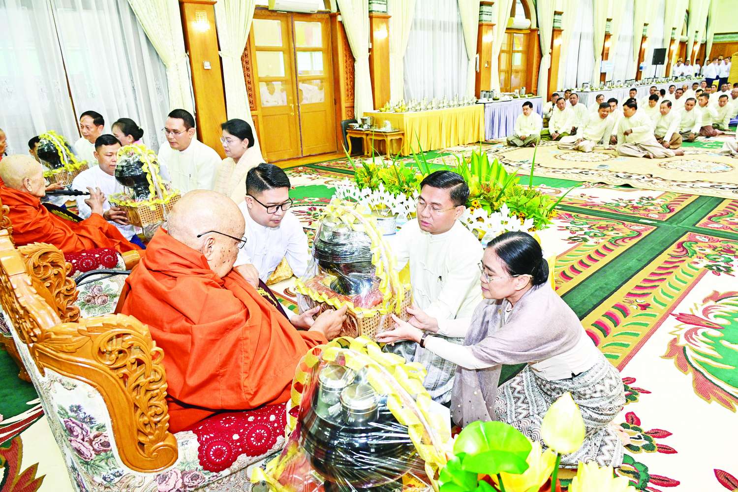 ၂၀၂၅ ခုနှစ်၊ ကာကွယ်ရေးဦးစီးချုပ်ရုံး (ကြည်း၊ ရေ၊ လေ) မိသားစုများ ဝါဆိုသင်္ကန်းဆက်ကပ်လှူဒါန်းပွဲ မင်္ဂလာအခမ်းအနားကို ယနေ့နံနက်ပိုင်းတွင် ကာကွယ်ရေးဦးစီးချုပ်ရုံး (ကြည်း)၊ အနော်ရထာခန်းမ၌ ကျင်းပပြုလုပ်ရာ နိုင်ငံတော်စီမံအုပ်ချုပ်ရေးကောင်စီဥက္ကဋ္ဌ တပ်မတော်ကာကွယ်ရေးဦးစီးချုပ် ဗိုလ်ချုပ်မှူးကြီး မင်းအောင်လှိုင်နှင့် ဇနီး ဒေါ်ကြူကြူလှတို့ တက်ရောက်ကြည်ညို၍ ဝါဆိုသင်္ကန်း၊ လှူဖွယ်ပစ္စည်းများနှင့် နေ့ဆွမ်းတို့ကို ဆက်ကပ်လှူဒါန်းသည်။